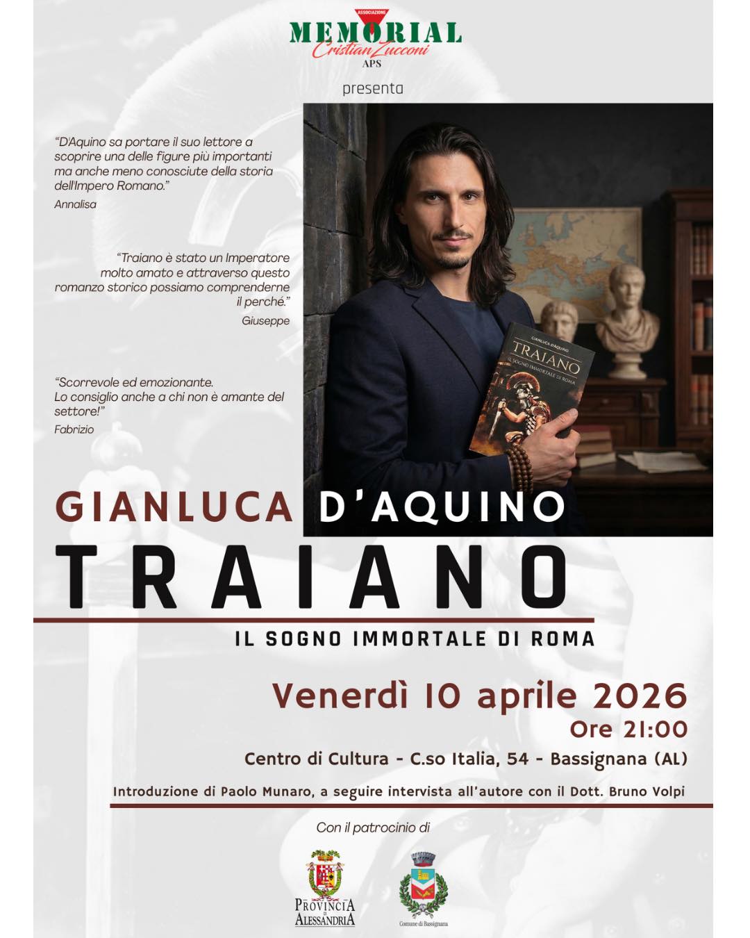 BASSIGNANA – La vita e la visione illuminata di un imperatore capace di condurre Roma al culmine della sua età aurea, restituendole quel senso di civiltà e giustizia che sembrava perduto: l’Associazione Memorial Cristian Zucconi è lieta di invitare il pubblico alla presentazione del romanzo “Traiano – il sogno immortale di Roma” dello scrittore Gianluca D’Aquino, in programma venerdì 10 aprile alle ore 21.00 al Centro di Cultura di Bassignana (AL). Pluripremiato e finalista al prestigioso Premio “Fiuggi Storia”, il romanzo di D’Aquino è al tempo stesso biografia basata su solide fonti storiche, racconto epico e affresco umano: uno sguardo profondo su un passato lontano, che diventa strumento prezioso per analizzare anche il nostro presente. L’autore sarà intervistato dallo scrittore alessandrino Bruno Volpi, in un dialogo che accompagnerà il pubblico alla scoperta di uno dei più grandi protagonisti della storia di Roma: Marco Ulpio Traiano. La serata ha il Patrocinio della Provincia di Alessandria e del Comune di Bassignana.