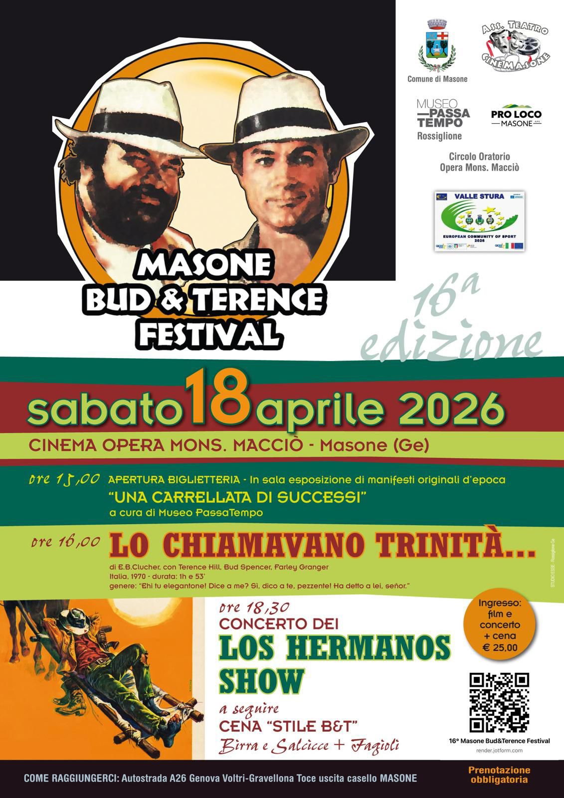 MASONE (GE) – Masone si prepara a rendere omaggio a due icone intramontabili del cinema italiano con la 16ª edizione del “Masone Bud & Terence Festival”, in programma sabato 18 aprile al Cinema Opera Mons. Maccio`. L’evento, ormai appuntamento fisso per appassionati e nostalgici, celebra la leggendaria coppia formata da Bud Spencer e Terence Hill, simbolo di un cinema popolare capace di attraversare generazioni.