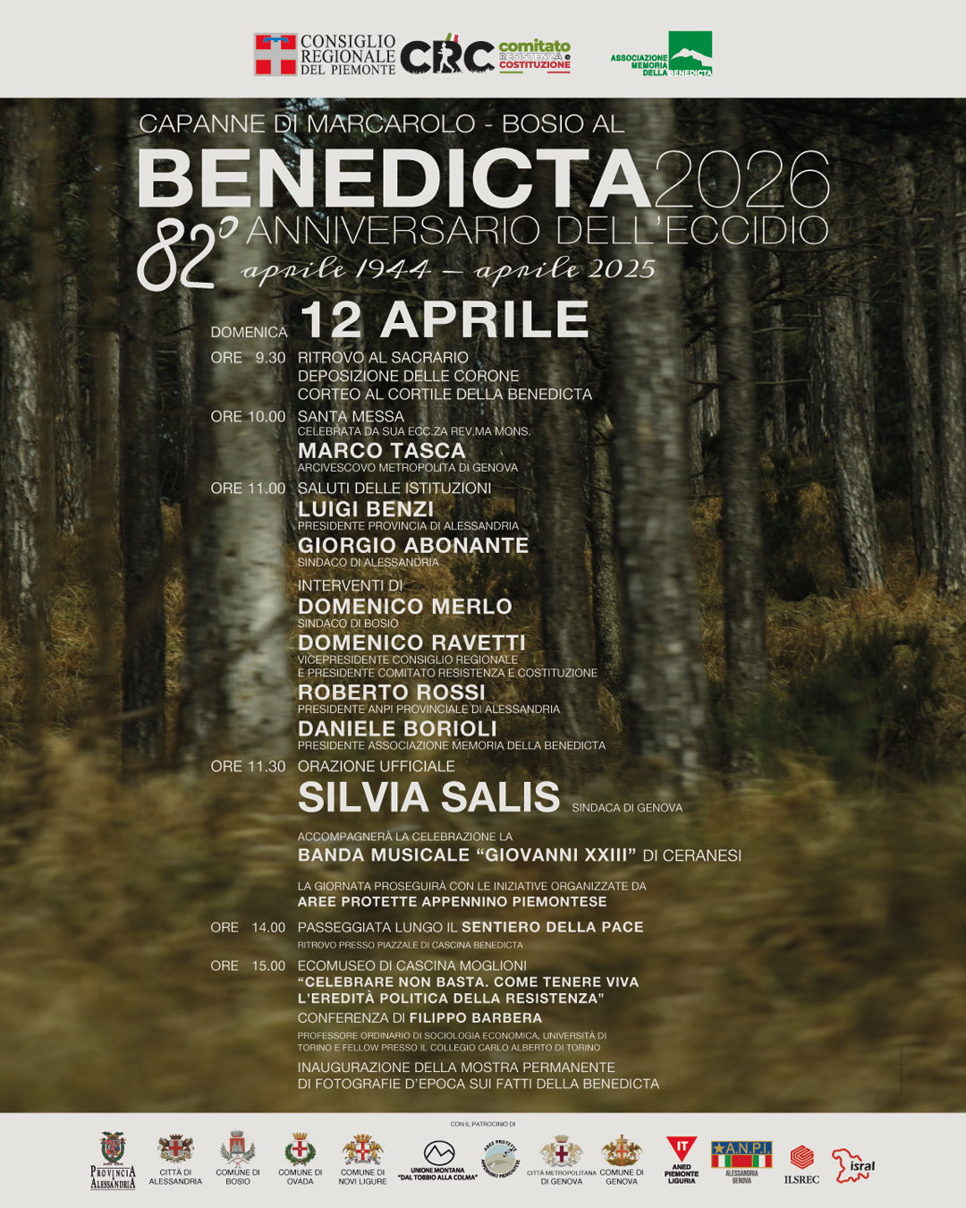 A partire dalle 11 spazio agli interventi istituzionali. Dopo i saluti delle autorità, prenderanno la parola diversi rappresentanti del territorio e delle istituzioni: Luigi Benzi, presidente della Provincia di Alessandria; Giorgio Abonante, sindaco di Alessandria; Domenico Merlo, sindaco di Bosio; Domenico Ravetti, vicepresidente del Consiglio regionale e presidente del Comitato Resistenza e Costituzione; Roberto Rossi, presidente ANPI provinciale di Alessandria; e Daniele Borioli, presidente dell’Associazione Memoria della Benedicta.