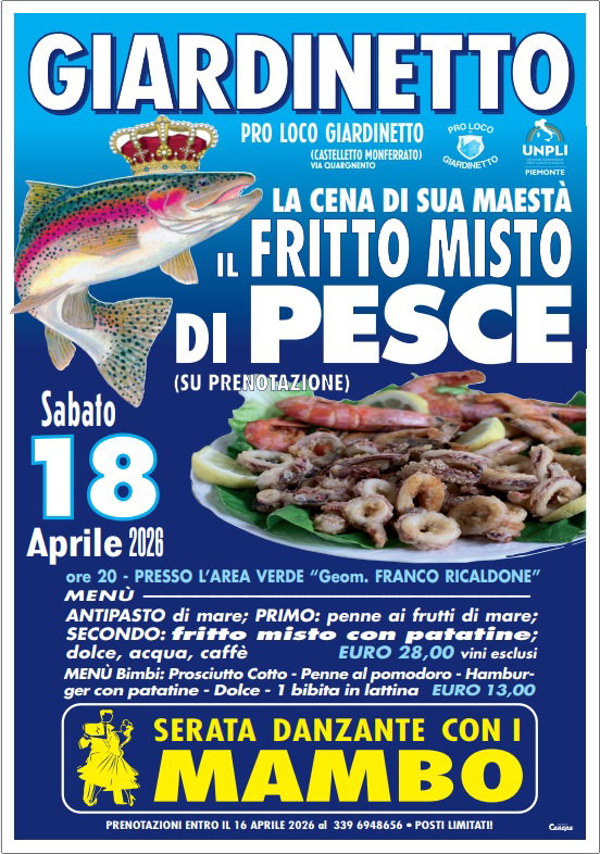 GIARDINETTO – A Giardinetto, frazione di Castelletto Monferrato, torna uno degli appuntamenti più attesi della primavera: la cena dedicata al fritto misto di pesce, organizzata dalla Pro Loco Giardinetto. L’evento si terrà sabato 18 aprile 2026, a partire dalle 20, nell’area verde “Geom. Franco Ricaldone”.
