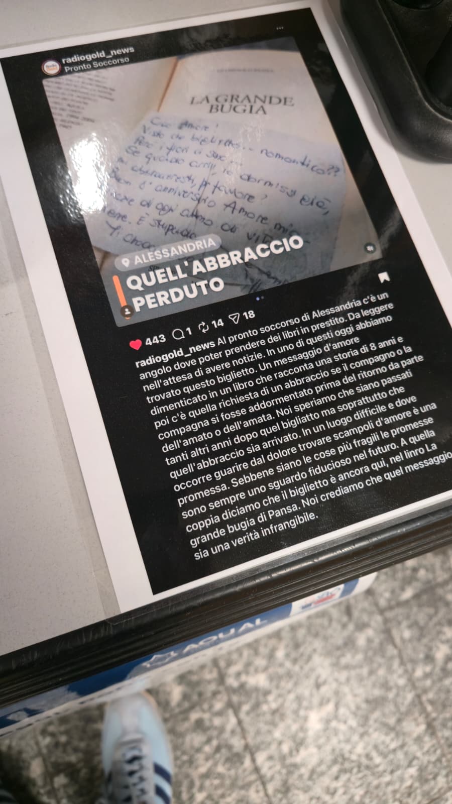 ALESSANDRIA – Sembrava un “abbraccio perduto” e invece quell’abbraccio non si è mai interrotto e resiste da 27 anni. Le storie a volte hanno un lieto fine e disegnano un sorriso confortante anche in mezzo a luoghi complicati come il pronto soccorso. Proprio lì, sabato, ci siamo imbattuti in un libro lasciato su una piccola scrivania per tentare di rompere l’attesa di chi vuole avere notizie dei parenti ricoverati o vuole ingannare il dolore di chi deve essere visitato. Tra le pagine di quel volume un biglietto su un fazzoletto di carta che spiegava l’amore di una donna verso il proprio compagno e l’attesa di un abbraccio al suo rientro nel caso in cui lei non fosse stata sveglia. Era un “biglietto d’amore” per l’anniversario che celebrava 8 anni di una storia piena d’affetto. Quel biglietto lo abbiamo postato su Instagram sperando davvero che quella storia non fosse fragile come la carta su cui era scritto. Le parole sono volate nel web e solo qualche decina di minuti dopo ha preso corpo la bellezza dell’imprevedibile: la figlia Marta di 23 anni ha visto quel messaggio tra i migliaia su Instagram, ha riconosciuto la scrittura della mamma e ci ha scritto. “Quella coppia esiste ancora e sta insieme da 27 anni” e racconta la storia di Raffaella, autrice del messaggio, e del marito Fortunato, per tutti detto “Tucci”, genitori anche dell’altra figlia, Agnese di 14 anni. Quel delicato messaggio tra le pieghe del libro “La Grande Bugia” ha svelato una immensa verità: quell’amore ha resistito al tempo, ha messo al mondo due figlie che poi hanno ricostruito questa storia tanto semplice quanto preziosa. Il biglietto lo abbiamo incorniciato e consegnato a questa famiglia, capace di dimostrare quello che dimentichiamo appena usciamo dal pronto soccorso di qualunque città: in quei posti, come nella vita, conta solo l’affetto, non importa di chi. Andare lì è durissimo per tutti ma sicuramente è uno dei posti in cui trovarlo, con la speranza di non dimenticarlo. L’unico posto in cui si capisce cosa conta davvero.
