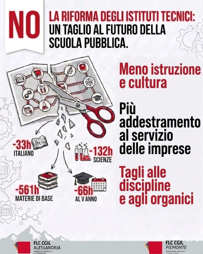 ALESSANDRIA – La Flc Cgil Alessandria è fortemente preoccupata per la riforma degli ordinamenti dell’istruzione tecnica. “Non siamo di fronte a un semplice aggiornamento dei percorsi scolastici, ma a una trasformazione profonda che rischia di snaturare il ruolo e la missione degli istituti tecnici, riducendoli a strumenti funzionali alle esigenze immediate del mercato del lavoro. Si indeboliscono le discipline di indirizzo e l’area dell’istruzione generale in nome di una presunta “flessibilità”. Ma meno formazione teorica significa meno capacità critica, meno strumenti culturali, meno possibilità per studentesse e studenti di comprendere i cambiamenti economici, sociali e tecnologici del nostro tempo“.