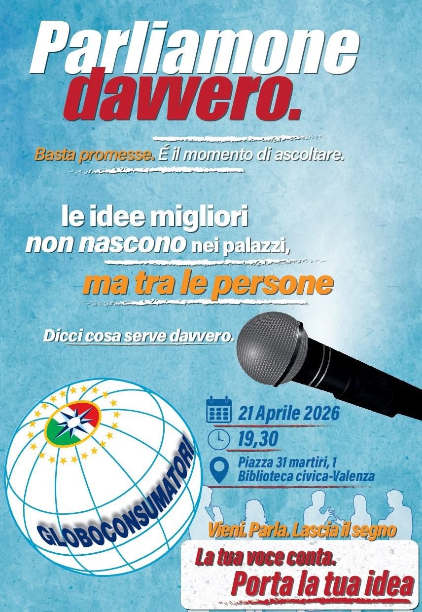 VALENZA – Incontro di Globo Consumatori martedì 21 aprile 2026, alla Biblioteca Civica di Valenza in piazza 31 Martiri, alle 19.30, sul mondo del volontariato. L’appuntamento vuole ascoltare le “idee migliori” per portare avanti progetti che possano far migliorare la città. Tutte le associaizoni sono invitate.