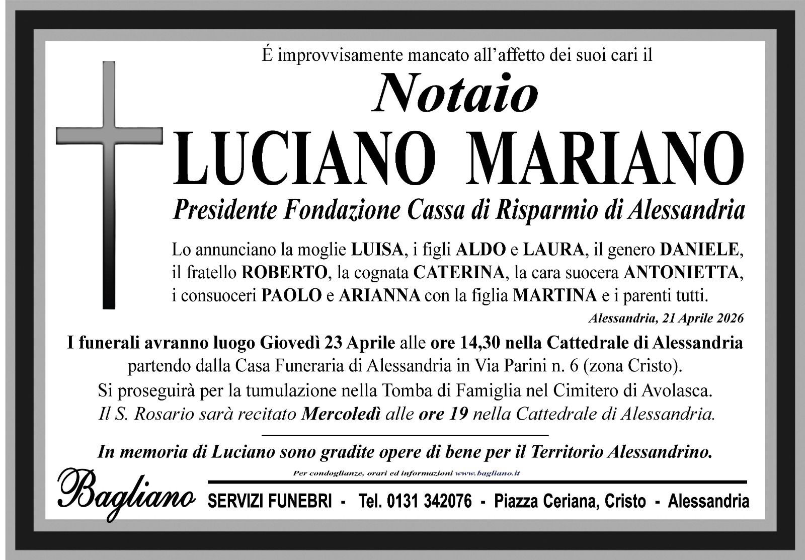 ALESSANDRIA – Sono state comunicate le date del rosario e del funerale del Presidente della Fondazione Cassa di Risparmio di Alessandria, il notaio Luciano Mariano, deceduto improvvisamente martedì 14 aprile 2026.