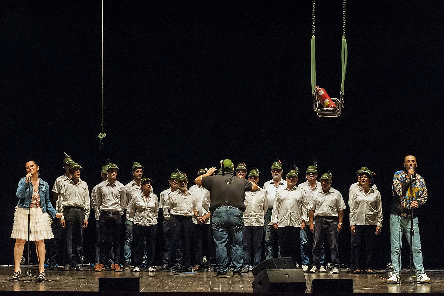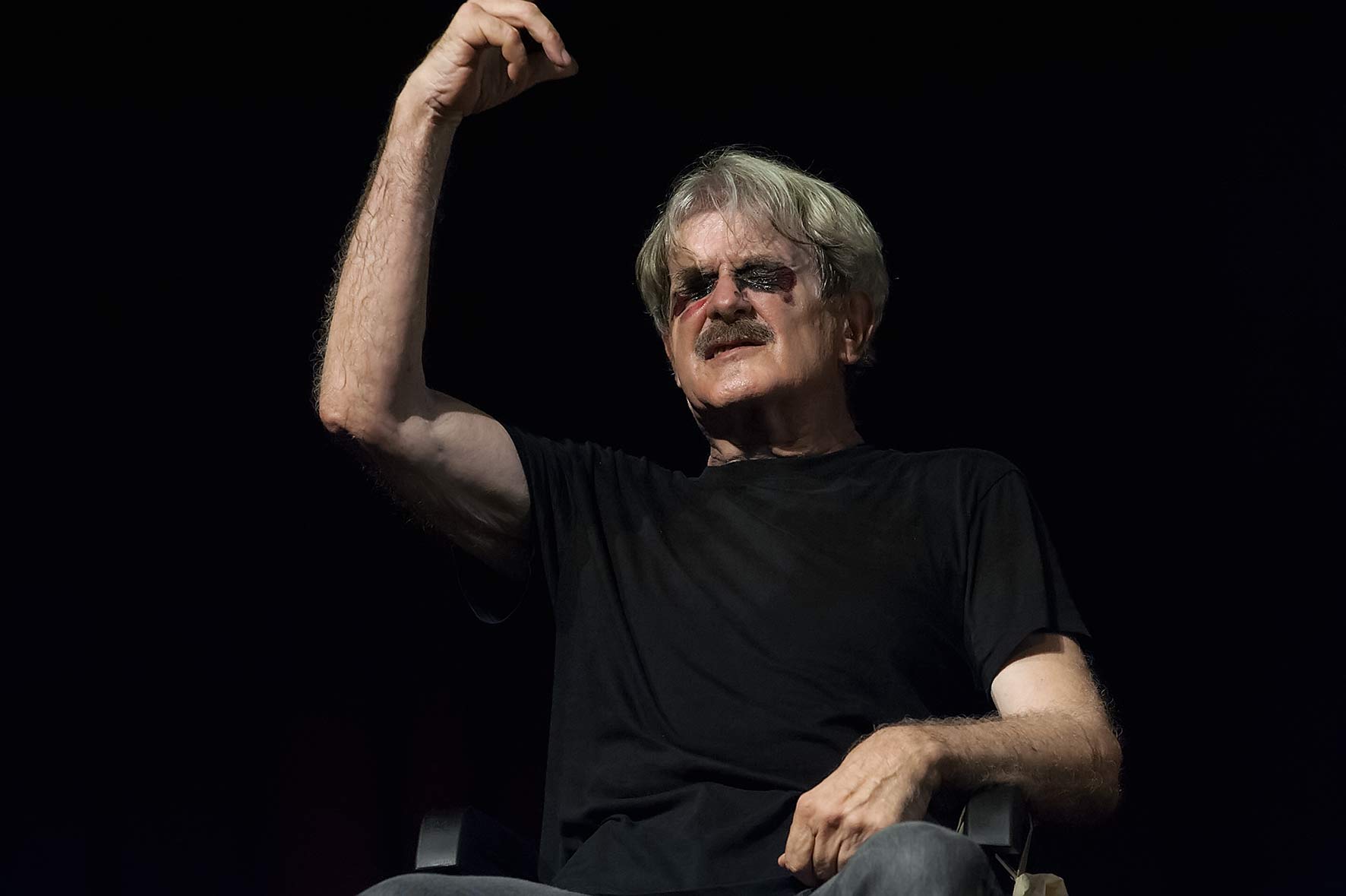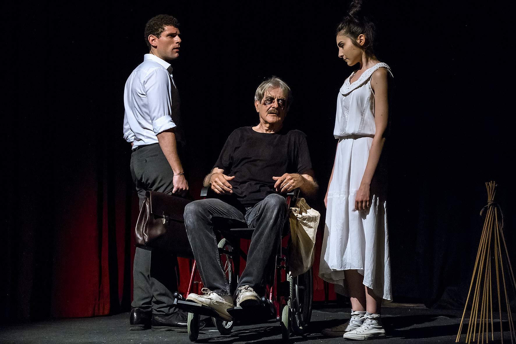 Mercoledì 26 la serata è iniziata con un’immersione in una società gretta, kitch e pop al Teatro Alfieri con BabiloniaTeatri in “Calcinculo” di e con Enrico Castellani e Valeria Raimondi (con loro, in apparizioni da tuttofare, anche il direttore di scena Luca Scotton). I protagonisti procedono per flash inseriti in un contesto da festa provinciale, dove il cancinculo è la giostra a seggiolini del luna park, dove una cantante in gonnellina di tulle e giubbotto di jeans si esibisce nella sua gamma di canzoni pop-melodiche e dove i toni sono quelli del divertimento omologato, della risata forzata e della mancanza di pensiero vitale. Quella dipinta è una realtà disimpegnata, distratta eppure aggressiva. In strofe cantate come “io ero il vertice della protesta / rivoluzione nella mia testa…anche il mio credo è appassito …il mio è un rosso relativo / è un Campari nell’aperitivo / un Negroni a colazione / il disincanto è la mia costellazione» non sembrano lontani i polli di allevamento che odiano “ormai per frustrazione e non per scelta” di Gaber. E’ un teatro-canzone, ma anche un musical , dove si inseriscono momenti paradossali come una sfilata di cani, presentata come evento straordinario, esilarante per la dicotomia evidente tra enfasi e realtà prosaica. Nella giostra di allegria sopra le righe la tessitura è caustica. Emerge la paura verso tutti, radice di odio e divisioni, campeggiano le bandiere della Liga veneta con il leone di San Marco (che dovrebbe invece volare in alto, si dice in un passo dello spettacolo), aleggia la sinistra ipotesi della necessità di un’autorità forte che si sostituisca alle scelte collettive (e si sa che la deriva autoritaria è ciclica nella storia). Geniale ed esilarante il coro di alpini che canta nel finale “Mi serve un metro per misurare la realtà”: il “centro di gravità permanente” non potrebbe essere più lontano. Tanti e ben riconoscibili gli spunti organizzati in una drammaturgia coerente e originale. La poetica di Babilonia Teatri è una reinvenzione del teatro-canzone e arriva forte e chiara, è godibile, profonda e intelligente, giustamente apprezzata dal pubblico di Asti Teatro. Il festival, con il suo tanto pubblico, a questo punto della serata si è spostato al Diavolo Rosso, bella ex chiesa barocca, per la prima nazionale di “Un Edipo”, con il grande Giuseppe Pambieri, affiancato da Silvia Micunco e Giuseppe Spezia, per la regia di Nicola Fano. Il mito offre sempre nuove chiavi di lettura del presente e, in questo caso, del rapporto padri-figli, anziani-giovani. Silvia Micunco (ora Antigone ora Giocasta, ora coro finale dell’Edipo re) parla attraverso i versi di Sofocle, mentre Pambieri (un Edipo anziano e sulla sedia a rotelle) e Spezia (un giovane colletto bianco ma anche figlio dell’indovino Tiresia) dialogano sull’eterno conflitto tra vecchi e giovani. Edipo, accecatosi dopo la scoperta di aver assassinato il padre e sposato la propria madre, si dichiara un monito vivente contro chi vuole esprimere un punto di vista sulla realtà. La sua percezione del reale non corrispondeva al vero, ma la sua esperienza pregressa non è un bagaglio utile alla generazione successiva. Il giovane figlio di Tiresia, che vuole scoprire perché Edipo non si è fidato dei vaticini del padre, rivela man mano il suo astio di appartenente ad una generazione preparata per regole che non valgono più e incapace di sognare un futuro.