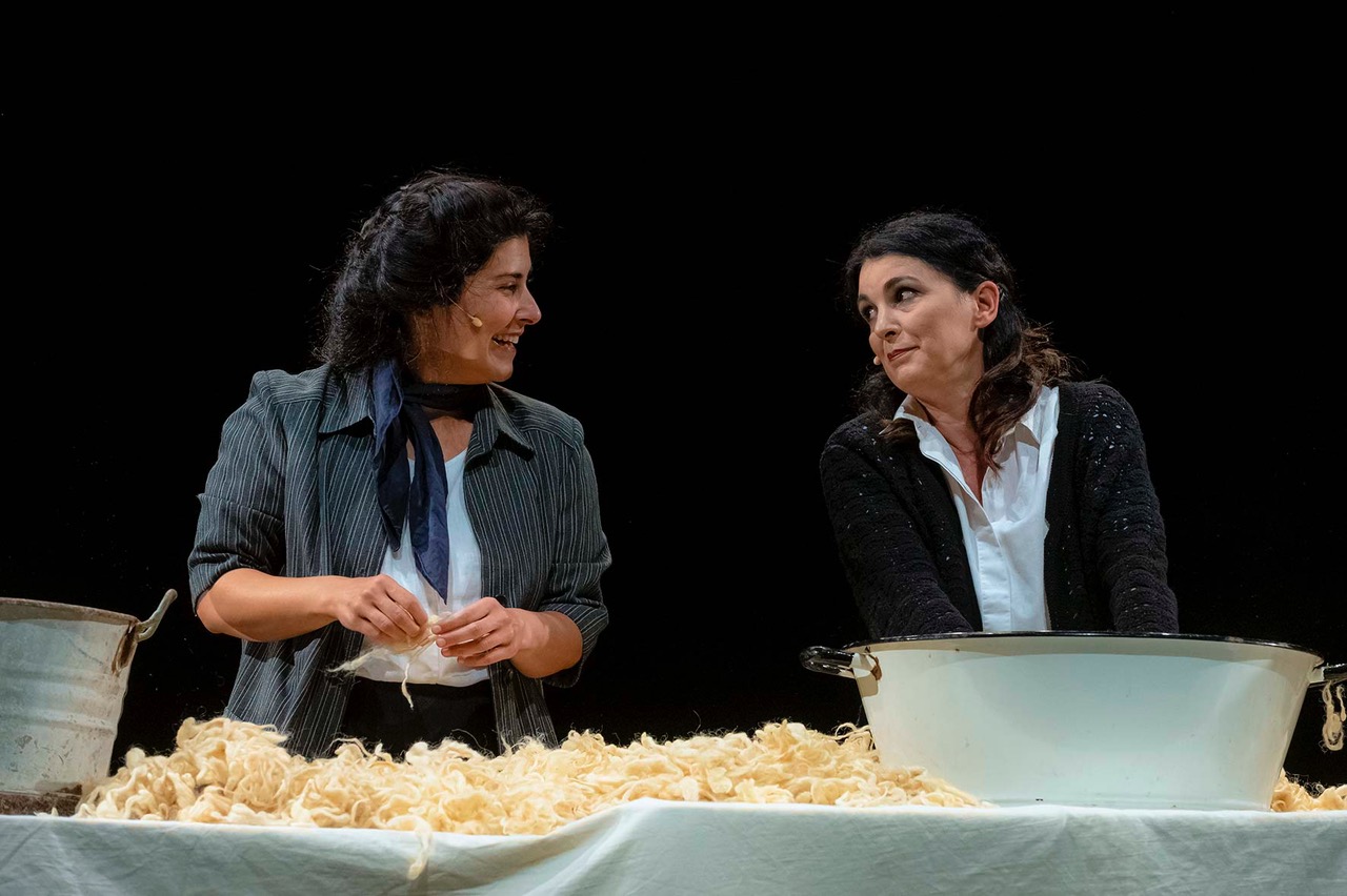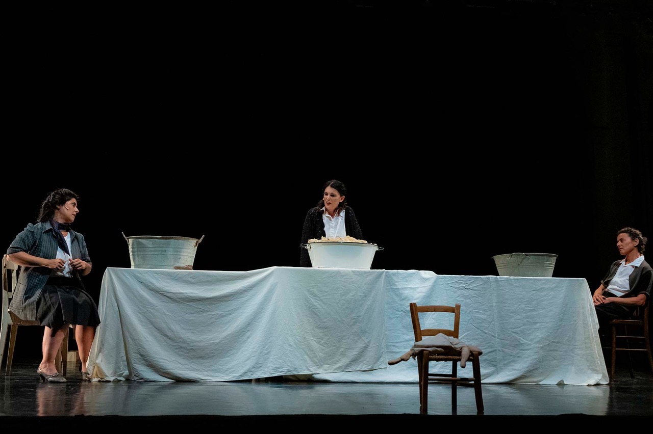“Questa storia nei libri di storia non c’è”. I treni della felicità sono stati quei convogli che, nel primissimo dopoguerra, hanno trasportato migliaia di bambini di famiglie poverissime del sud presso famiglie contadine e operaie del nord e del centro, disponibili ad ospitarli per pura solidarietà. L’iniziativa fu presa dalle donne dell’UDI (Unione Donne Italiane) con quelle del Partito Comunista e fu una vera opera di ricostruzione dell’Italia, in nome dell’accoglienza e dell’accudimento. Sulla scena Fiammetta Bellone, Federica Carruba Toscano, Egle Doria sono loro stesse, nel loro essere donne e nel loro modo di intendere la maternità. Si presentano con il loro nome, stabilendo con il pubblico “il patto implicito che tra noi e voi l’incredulità è sospesa”, diventano le donne che hanno ideato l’impresa, le madri e le bambine. In una scena che cambia continuamente, grazie a vecchi tavoli spostati e capovolti a formare ambienti diversi, si materializzano storie che passano attraverso nomi reali e corpi che soffrono e necessitano di protezione. Il flusso narrativo scorre, incanalato da gesti precisi e da una disposizione geometrica e sempre diversa degli oggetti di scena (tavoli, sedie, mastelli, lenzuola…), che sembra definire la torrenzialità del contenuto. Da un lato, madri costrette a lasciar partire i figli, per miseria o perché incarcerate a seguito di rivolte contadine, dall’altro famiglie, anch’esse contadine o operaie, disposte a sfamare una bocca in più e a regalare affetto. Tra loro le storie dei bambini, una vicenda corale che prende forma nelle singolarità, nei particolari e nel sentire del preciso individuo. Fiammetta Bellone, Federica Carruba Toscano, Egle Doria cambiano voce, parlano dialetti e assumono cadenze diverse, scavano nella memoria e vivificano ricordi collettivi e singoli di una vicenda epocale. Lo fanno con il corpo, con uno spirito sanguigno che sa di istinto atavico e saggezza popolare, con una verità che rende merito alla Storia in maiuscolo. Sono bambine diffidenti, ostili, impaurite e dotate solo di istinto di sopravvivenza, per diventare, un attimo dopo, le stesse invecchiate, protagoniste e testimoni della storia. Ormai anziane ricordano il viaggio, la paura di non essere scelte da nessuna famiglia ospitante, la nostalgia della mamma, la lingua incomprensibile