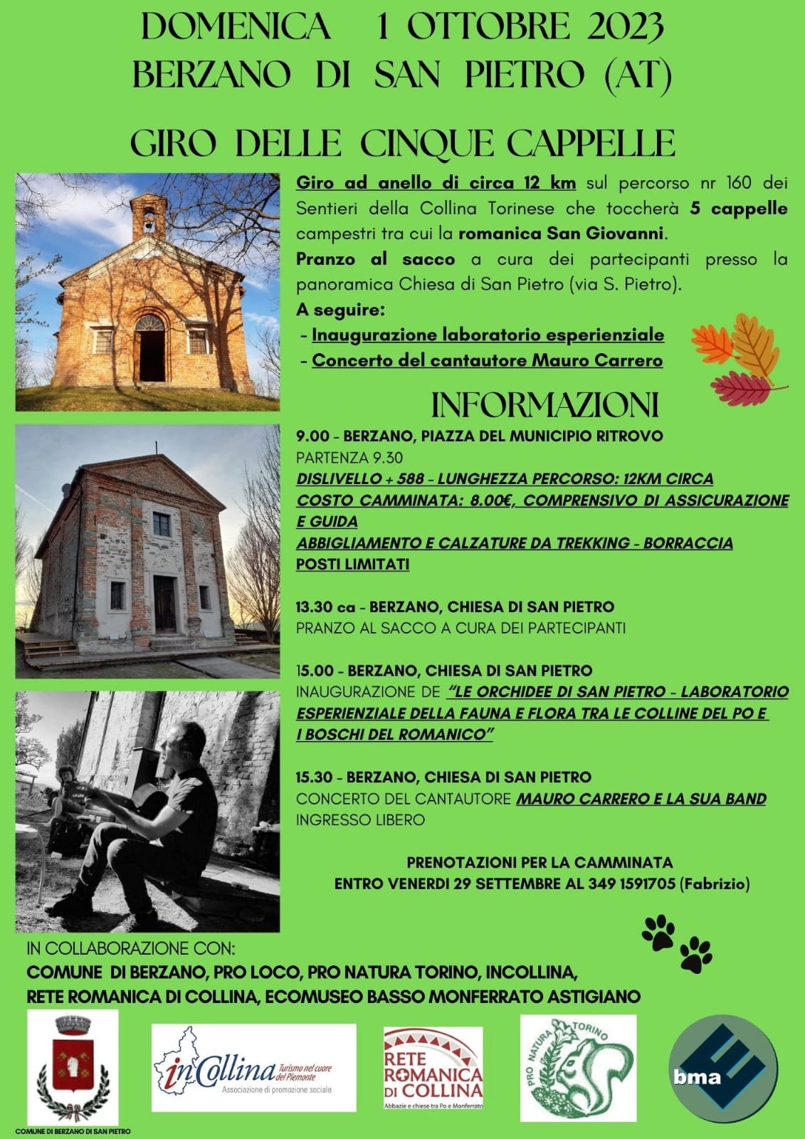Sempre nel cartellone degli “Itinerari Magnifici” rientra la Passeggiata Magnifica di domenica 1 ottobre, alle 9, a Berzano San Pietro, con giro delle cinque Cappelle e concerto di canzone d’autore con Mauro Carrero in quartetto. Pranzo al sacco. Prenotazioni: 349 1591705 (Fabrizio). Il progetto è realizzato con il contributo della Regione Piemonte e dei Comuni attraversati, in collaborazione con la Rete Ecomusei Piemonte, Laboratorio Ecomusei, l’Ente Turismo Langhe Monferrato Roero. Per info e programma completo: ecomuseobma.it e sui social