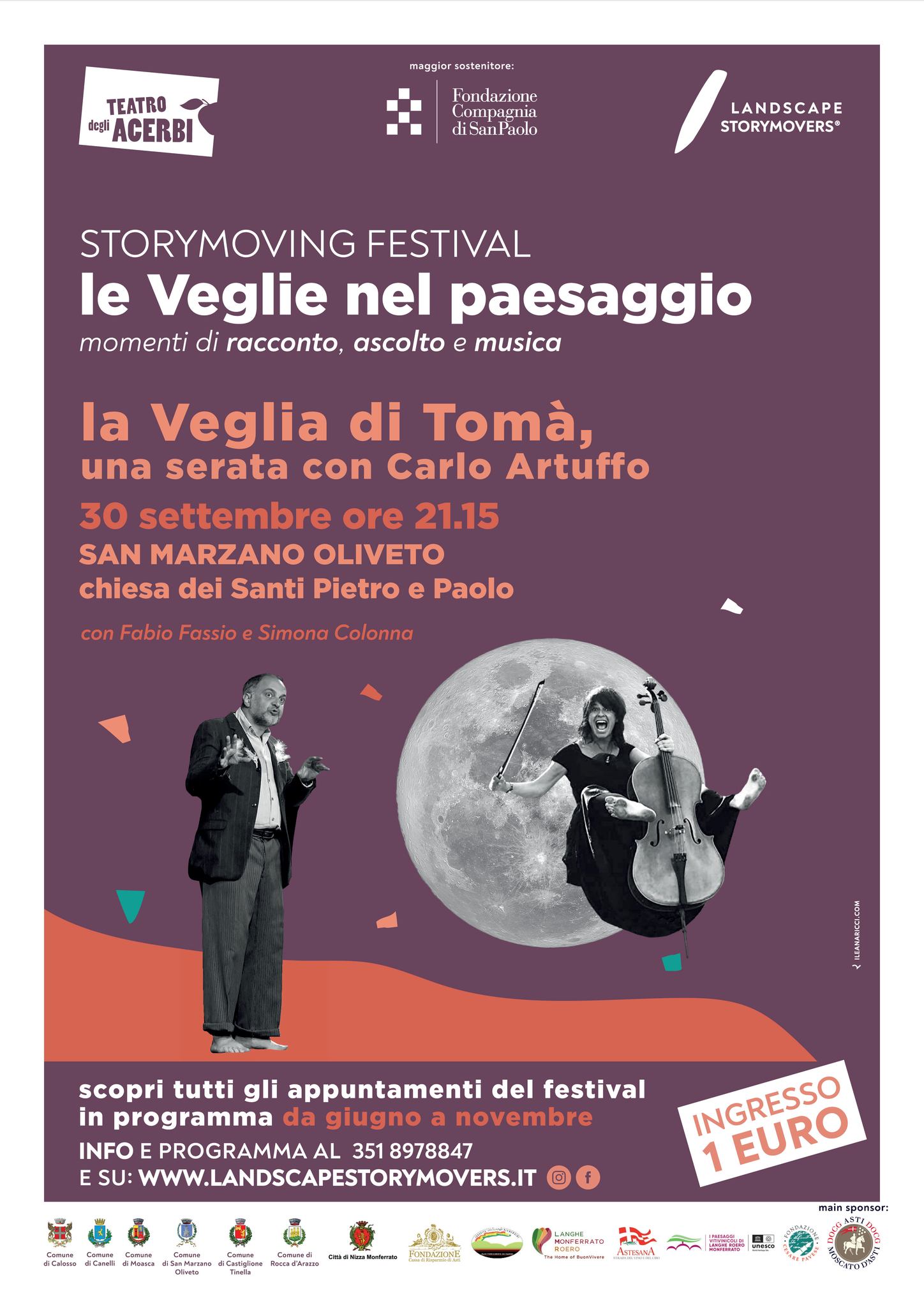 In questo fine settimana si terrà anche il primo appuntamento autunnale con lo “Storymoving Festival”, realizzato nell’ambito del progetto “Landscape Storymovers. Piano di narrazione e valorizzazione del paesaggio vitivinicolo astigiano del Patrimonio Unesco di Langhe Monferrato e Roero”, dedicato quest’anno alle Veglie nel paesaggio. Il 30 settembre a San Marzano Oliveto, alle ore 21.15 nella Chiesa dei Santi Pietro e Paolo, sarà in scena “La veglia di Tumà, una serata con Carlo Artuffo” con Fabio Fassio e Simona Colonna.