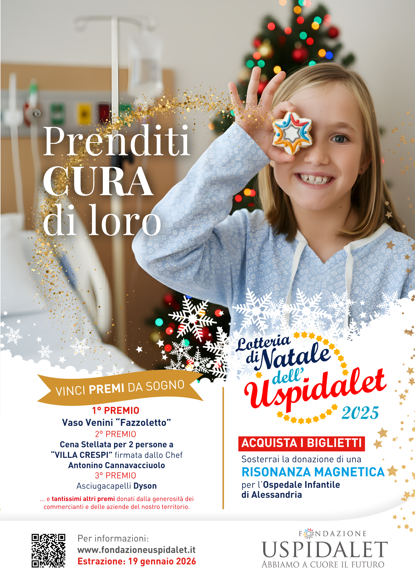 ALESSANDRIA – Torna come ogni anno la Lotteria di Natale della Fondazione Uspidalet di Alessandria. Il ricavato sarà interamente destinato all’acquisto di una risonanza magnetica per i piccoli pazienti dell’Ospedale Infantile Cesare Arrigo, in grado di eseguire tra le 2.200 e le 3.200 prestazioni all’anno. Oltre 150 i premi in palio: i primi tre sono un vaso Venini donato dall’azienda Damiani, una cena stellata a Villa Crespi dallo Chef Antonino Cannavacciuolo e un esclusivo asciugacapelli Dyson.