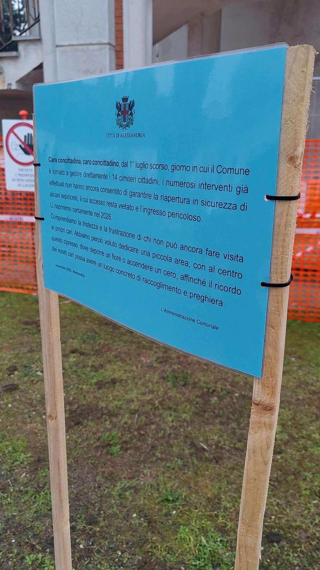 ALESSANDRIA – “Chiedo scusa a tutte e a tutti ma questi luoghi sono estremamente insicuri. Mi rendo conto del momento di tristezza ma chiedo ai cittadini di rispettare l’ordinanza comunale e di non entrare nei cinque sepolcreti”. Con queste parole e con l’installazione di tre piccole aiuole con fiori e un cipresso vicine ai cinque sepolcreti chiusi, il sindaco di Alessandria Giorgio Abonante ha ribadito la vicinanza dell’amministrazione comunale ai cittadini che nemmeno questa domenica 2 novembre, giorno della Commemorazione dei Defunti, potranno recarsi vicino alle lapidi dei propri cari per deporre un fiore. Chi vorrà potrà simbolicamente lasciare un fiore o un lumino proprio vicino a queste tre aiuole. Le cinque strutture del Cimitero Monumentale (il sepolcreto dietro la chiesa, i sepolcreti C e D dello scomparto II e i due sepolcreti dello scomparto XII), infatti, necessitano di importanti lavori di riqualificazione e non possono essere riaperte nemmeno temporaneamente.
