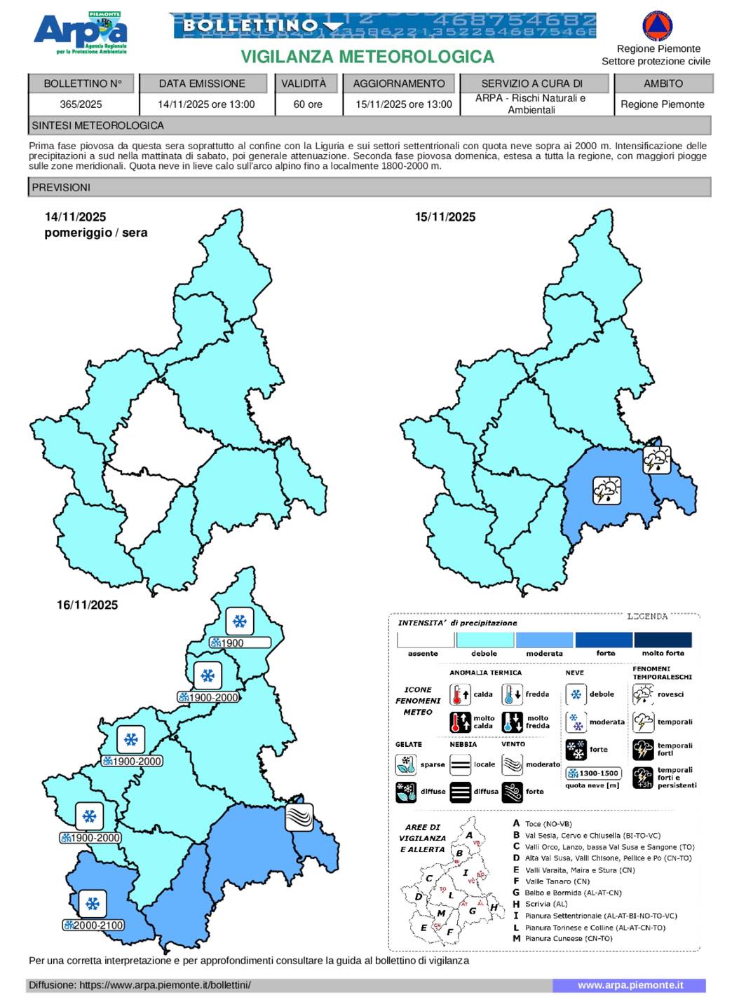 PROVINCIA DI ALESSANDRIA – Come ha evidenziato Arpa Piemonte nell’ultimo bollettino meteo, da questo venerdì sera è prevista una prima fase piovosa in particolare al confine tra Piemonte e a Liguria e sui settori settentrionali, con quota neve sopra ai 2 mila metri. Da sabato mattina, inoltre, probabile una intensificazione delle precipitazioni a sud, poi in generale attenuazione. Domenica pioverà ancora nella zona meridionale della regione.