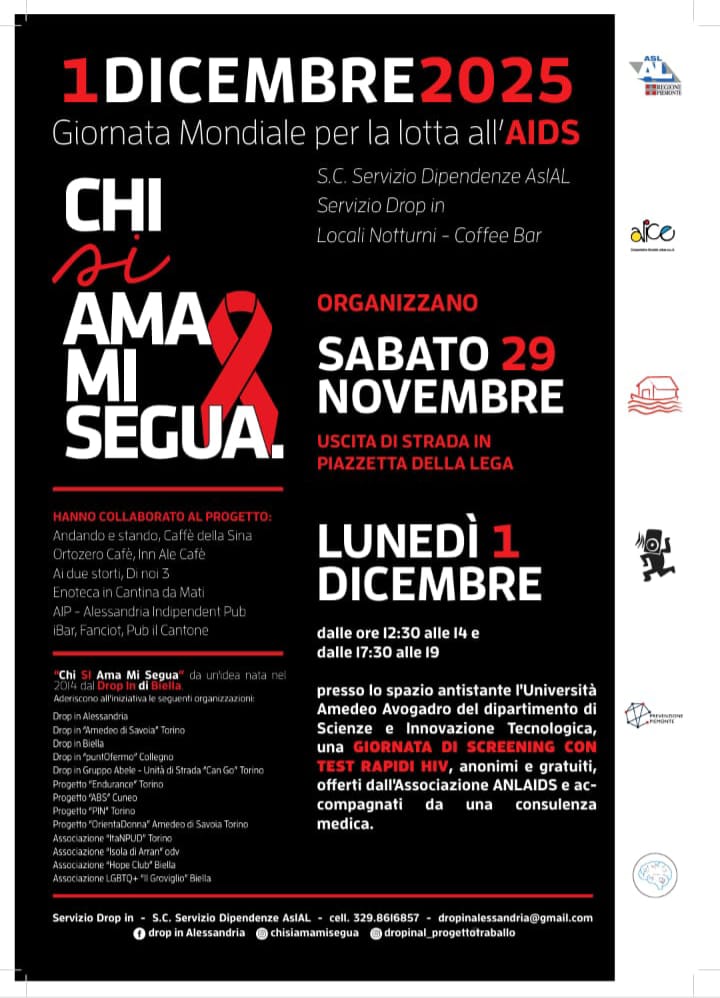 • In collaborazione con l’Azienda Ospedaliera Universitaria di Alessandria, lunedì 1° dicembre verrà allestita una postazione di screening per incentivare il test. Appuntamento dalle 12.30 alle 14 e dalle 17 alle 19, davanti alla sede del Disit dell’Università Amedeo Avogadro, in viale Michel 11. Saranno offerti test rapidi HIV, gratuiti e anonimi, grazie al supporto dell’Associazione ANLAIDS, con possibilità di consulenza medica.