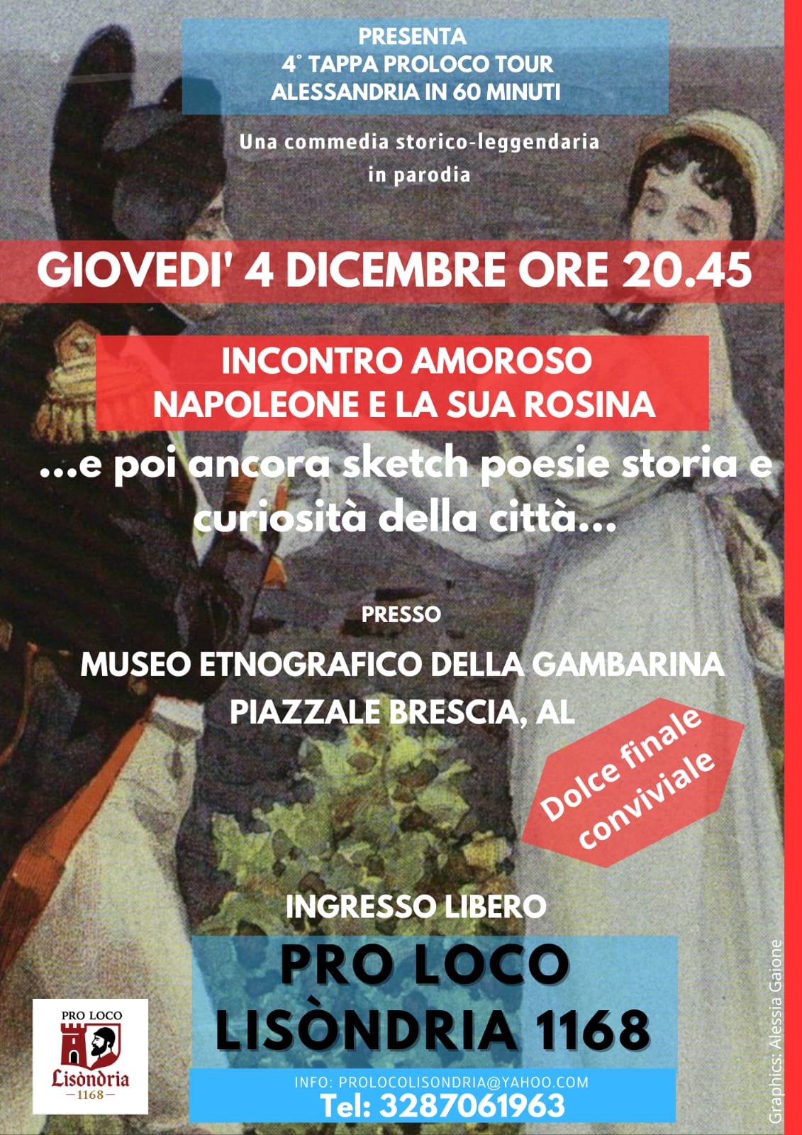 ALESSANDRIA – Quarta e penultima tappa della rassegna stampa di successo Pro Loco in Tour di Alessandria, organizzato dalla Pro Loco Lisòndria 1168. Il gruppo teatranti “I Lisandren” (Monica Bogliolo, Lorenzo Del Monte, Alessio Garbarino, Ezia Zulfarino, Alberto Carughi Cristina Saracano e Gianni Cestino) vi aspetta per raccontarvi un periodo storico più vicino a noi: il 1800, in particolare la storia di un amore devastante. Appuntamento giovedì 4 dicembre alle 20.45 al Museo Etnografico della Gambarina, in piazza della Gambarina ad Alessandria.