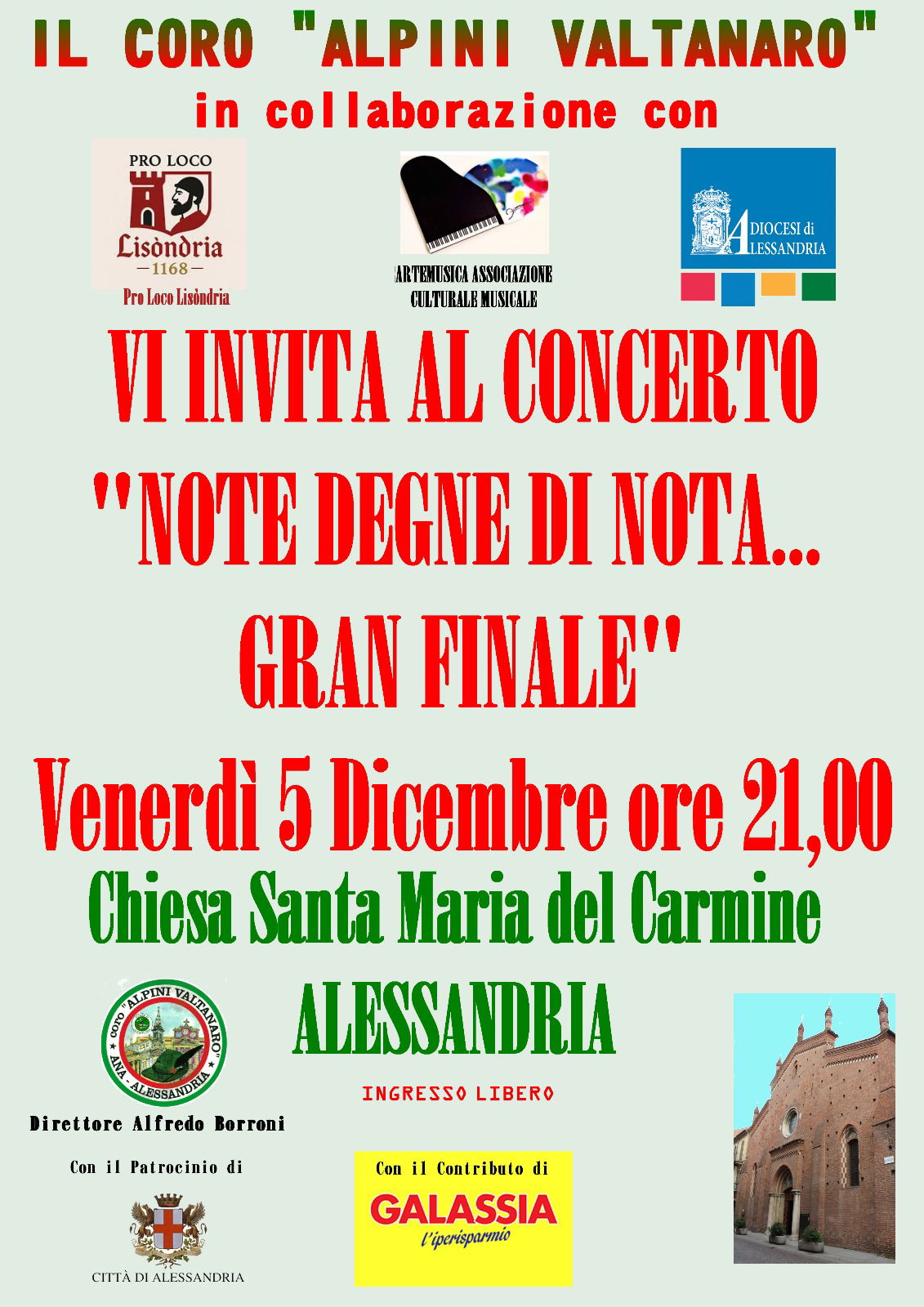 Il Coro Alpini Valtanaro terrà un Concerto il 5 dicembre, alle 21, nella Chiesa Parrocchiale Santa Maria del Carmine, in via dei Guasco ad Alessandria, come conclusione della Rassegna “Note degne di Nota”. Organizzato in collaborazione con la neo nata Pro Loco Lisóndria 1168, sarà l’occasione per intonare i primi canti natalizi della stagione.