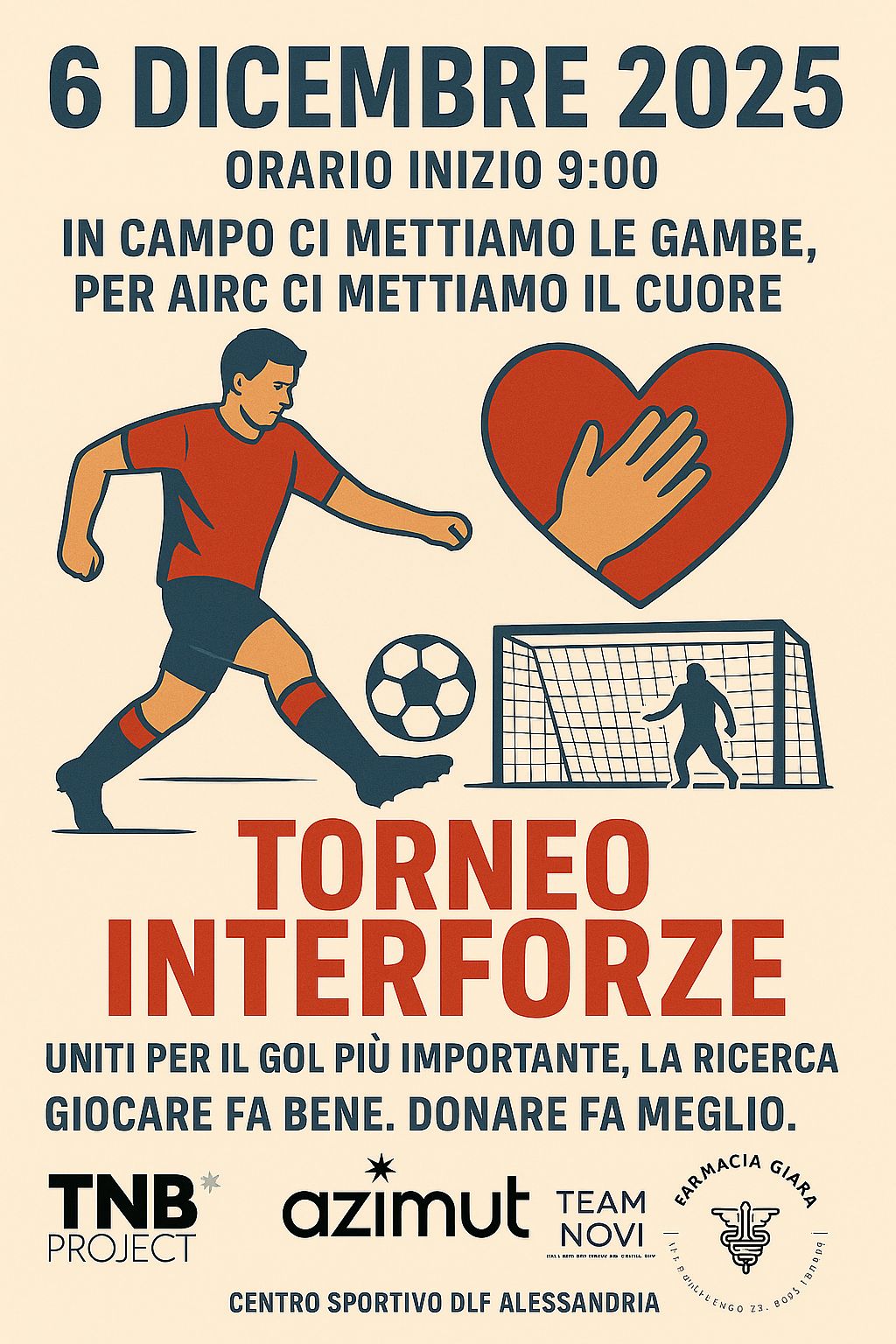 ALESSANDRIA – Questo sabato 6 dicembre 2025 a partire dalle 9 il centro sportivo Dlf di Alessandria ospiterà il Torneo Interforze di calcetto, promosso dai Vigili del Fuoco e il cui ricavato sarà interamente devoluto all’Associazione Italiana per la Ricerca sul Cancro. Ne abbiamo parlato su Radio Gold con i due pompieri Davide Gobbato e Giuseppe Trovato.