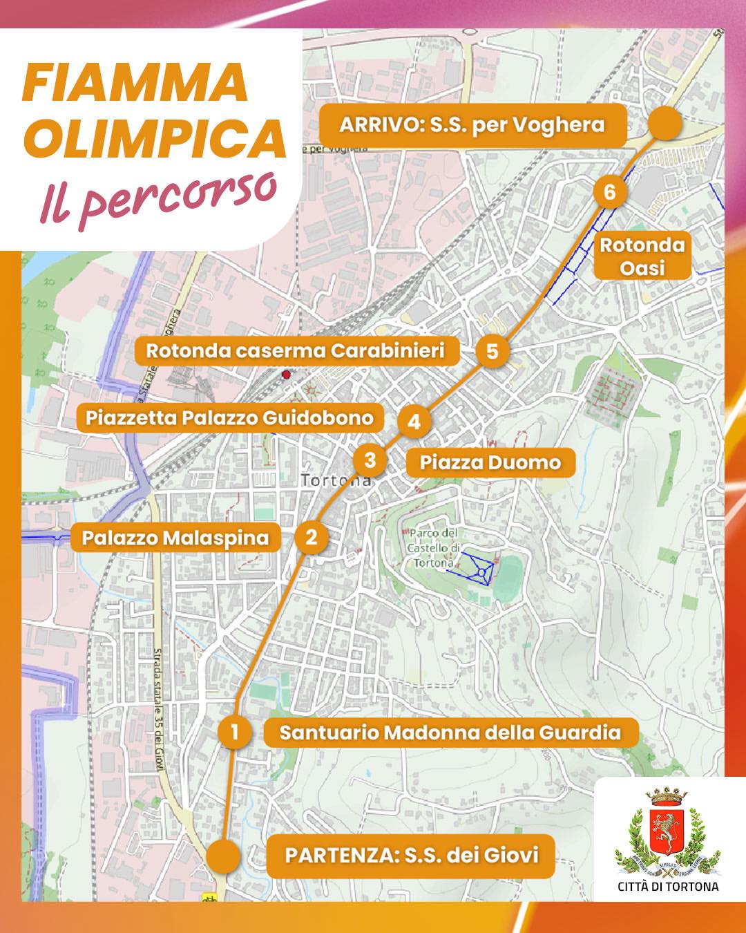 Tortona, infine, sarà l’ultima tappa piemontese della Fiamma che, in arrivo da Alessandria, attraverserà la città lungo ss dei Giovi, per poi passare Corso Don Orione e Via Emilia. In piazza Duomo è previsto il saluto del sindaco Federico Chiodi, esibizione di Fada_Lab e DJ set. In piazza Malaspina, invece, si terrà lo spettacolo a cura di Derthona Cheer. Quella di oggi sarà la 40esima tappa: dopo Alessandria e Tortona la fiaccola arriverà anche a Voghera, Bobbio, Lodi, Casalpusterlengo, Codogno fino a Piacenza.