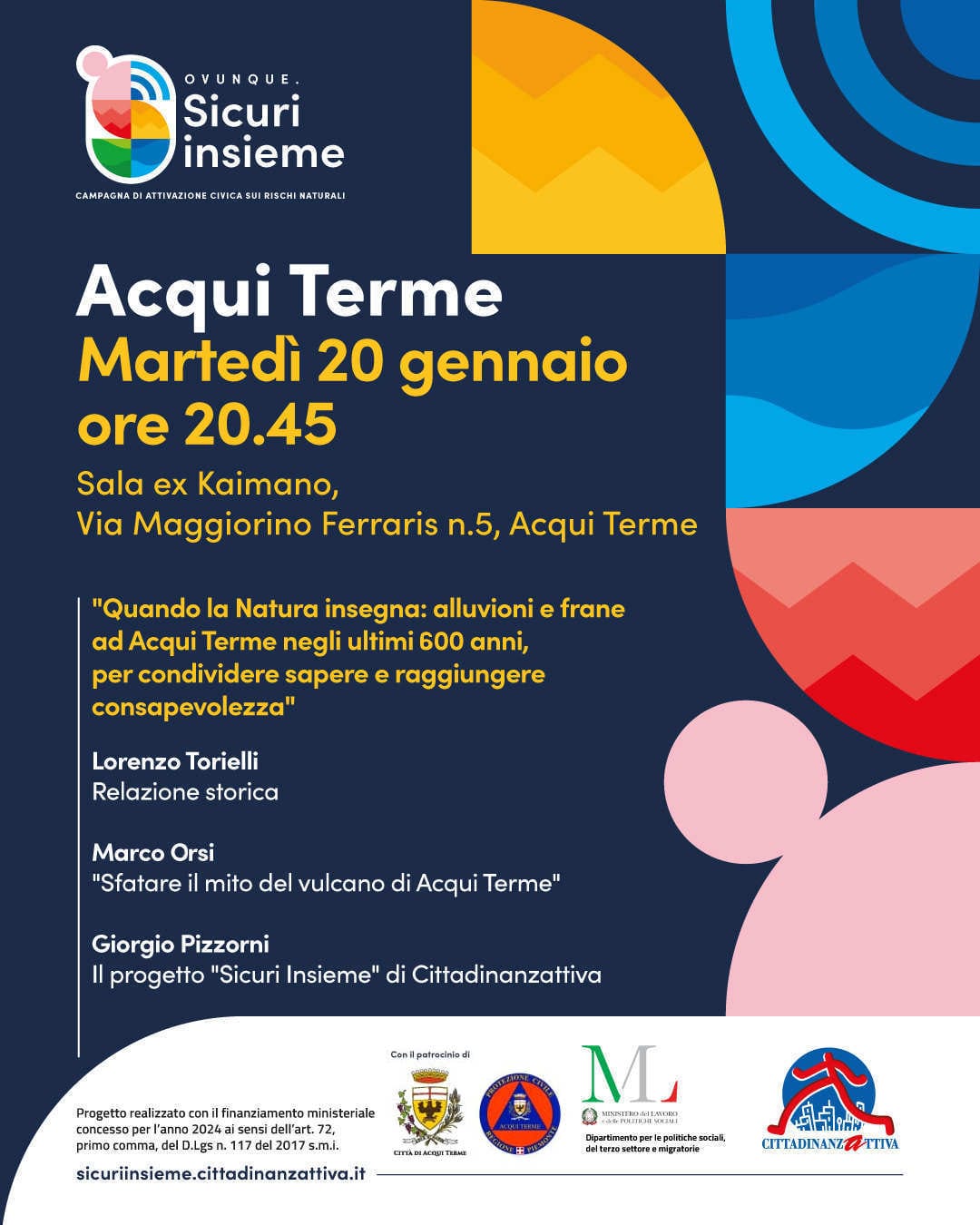 ACQUI TERME – Un convegno, parte del progetto Sicuri Insieme, realizzato da Cittadinanzattiva, dedicato alla conoscenza e alla prevenzione dei rischi naturali, si terrà ad Acqui Terme, martedì 20 gennaio alle 20.45 nella sala ex Kaimano, con l’obiettivo di approfondire gli eventi di alluvioni e frane che hanno interessato il territorio negli ultimi 600 anni e di promuovere una maggiore consapevolezza civica.