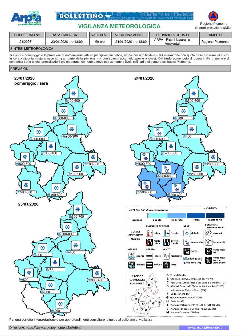 PROVINCIA DI ALESSANDRIA – Possibili nevicate questo sabato 24 gennaio 2026 in alcune zone della provincia di Alessandria. Nel suo ultimo bollettino meteo, Arpa Piemonte ha diramato una allerta gialla riguardo la pianura alessandrina, l’Acquese, il Novese, l’Ovadese e le Valli Stura e Lemme. In particolare tra questo venerdì pomeriggio e le prime ore di sabato sono attese precipitazioni deboli, un po’ più significative sull’Alessandrino con quota neve prossima al suolo. In serata pioggia mista a neve su gran parte della pianura, con possibili disagi alla viabilità.