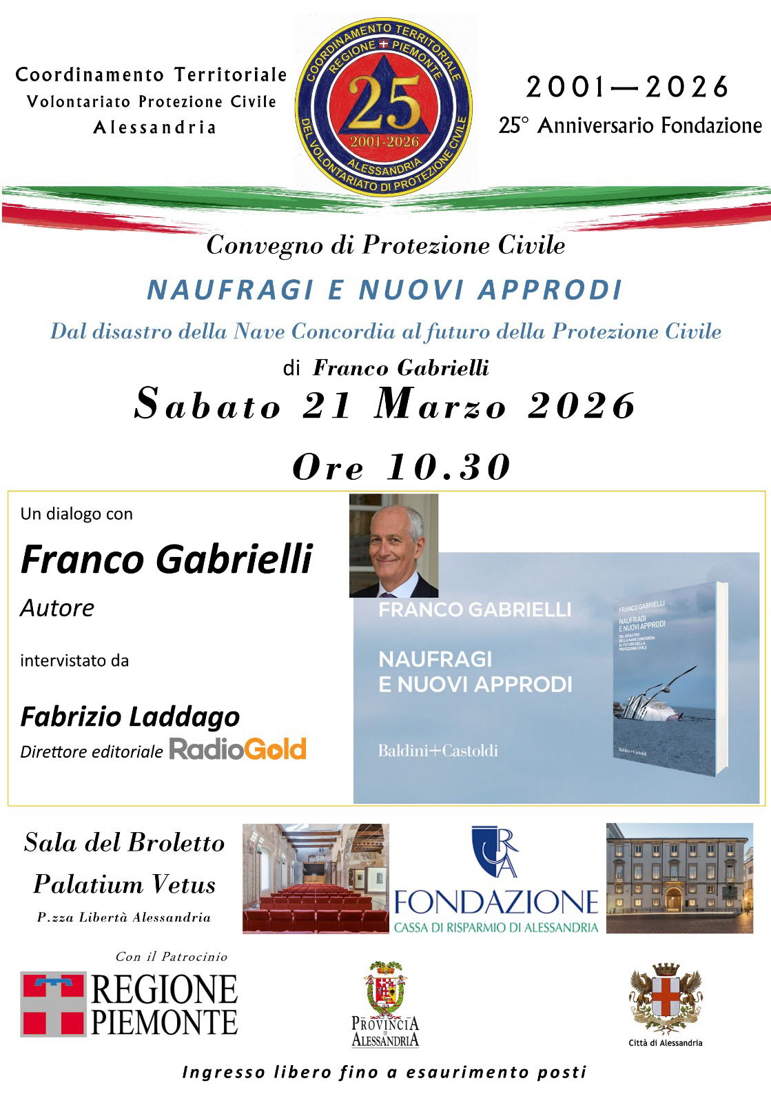ALESSANDRIA – In occasione delle celebrazioni per il suo 25° anniversario di fondazione, il Coordinamento Territoriale del Volontariato di Protezione Civile di Alessandria promuove un momento di alta riflessione istituzionale e sociale rivolto alla cittadinanza. Sabato 21 marzo 2026, alle 10.30, alla Sala del Broletto (Palatium Vetus) in piazza Libertà 28, si terrà un incontro che vedrà come protagonista Franco Gabrielli, già Capo del Dipartimento della Protezione Civile e figura di riferimento nelle istituzioni italiane.