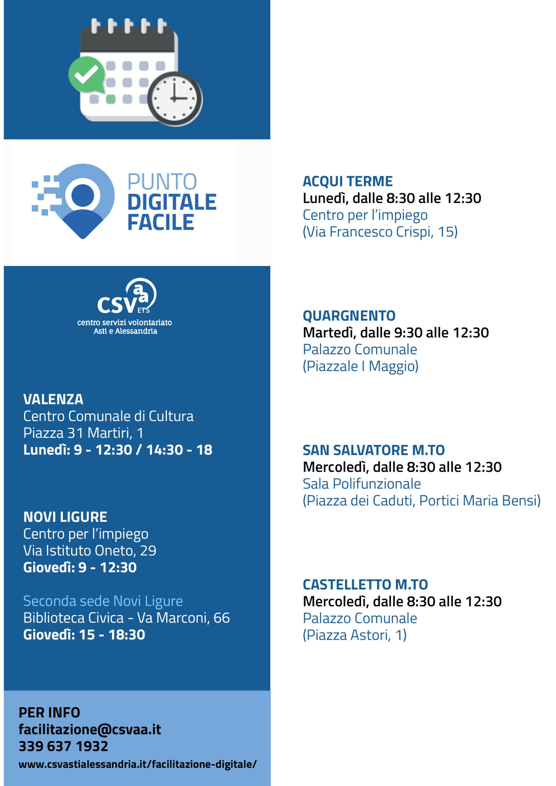 Queste iniziative si inseriscono nel più ampio progetto finanziato con risorse del PNRR – Piano Nazionale di Ripresa e Resilienza, Misura 1.7.2 “Reti di Facilitazione Digitale”, realizzato in collaborazione con la Regione Piemonte. Per ulteriori informazioni: al@csvastialessandria.it, 0131.25.03.89.