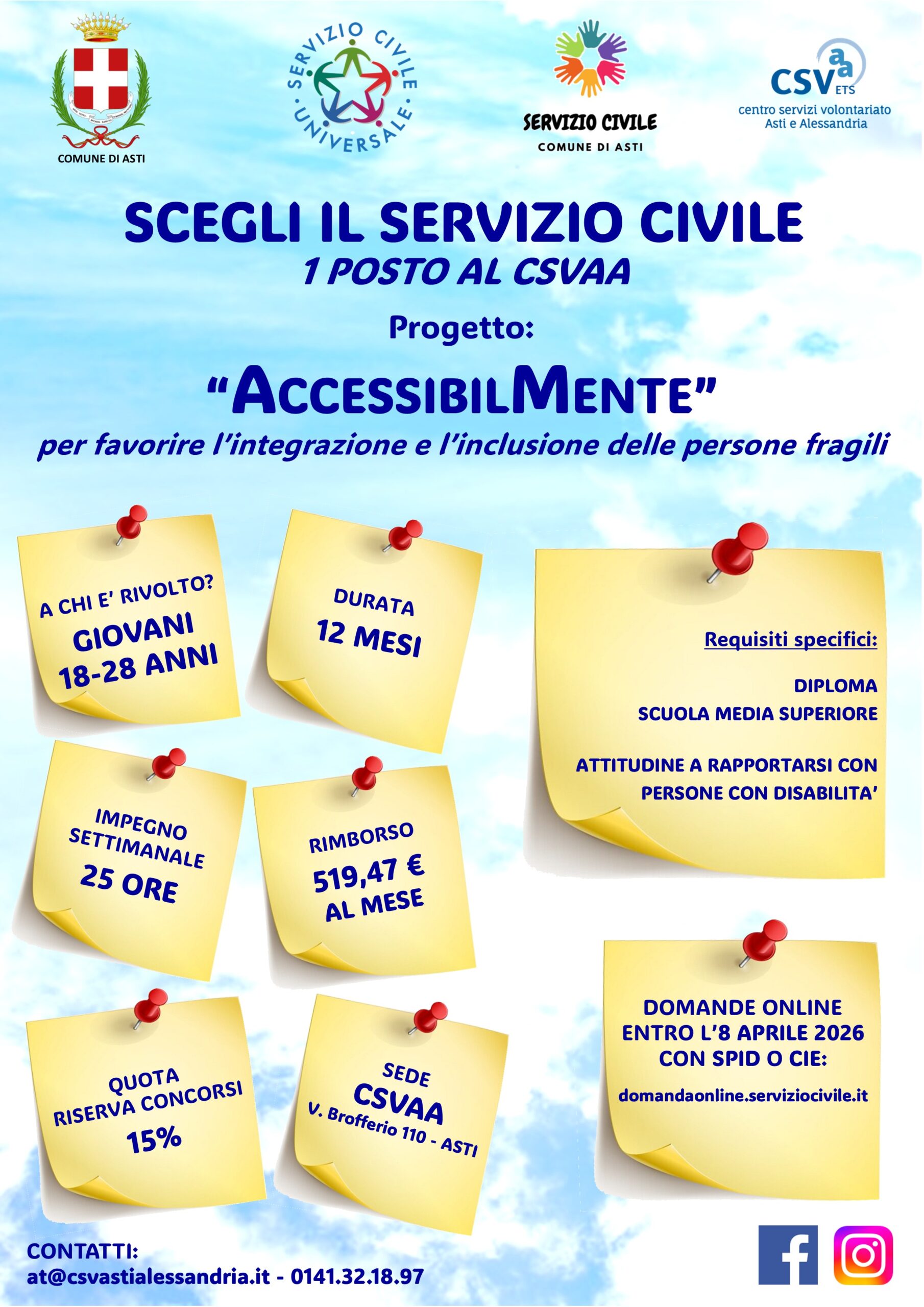 Per ulteriori informazioni sul progetto, contattare il CSVAA: at@csvastialessandria.it – 0141.321897 oppure Ufficio Servizio Civile Comune di Asti presso Informagiovani Asti: 0141.399215 – 334.1155574; 0141399423 – 0141.399534 oppure serviziocivile@comune.asti.it