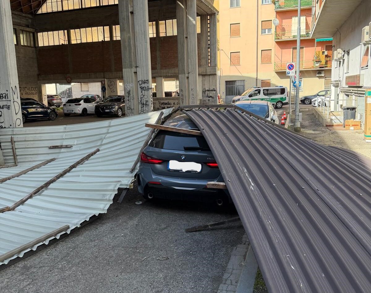 Foto di Pietro Matteo Gallo tratta dal gruppo Facebook “Novi Ligure-notizie e non solo” che ritrae la copertura in lamiera caduta ad Alessandria tra via Vinzaglio e via Bellini