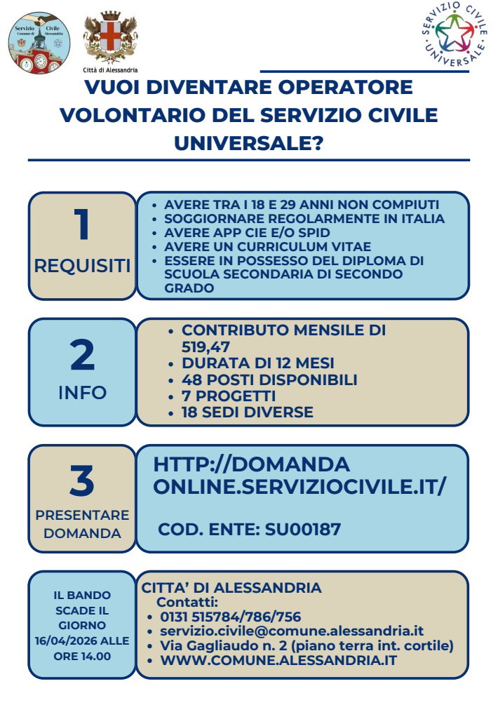 ALESSANDRIA – Con decreto del Capo del Dipartimento per le Politiche Giovanili e il Servizio Civile Universale è stata disposta la proroga dei termini per la presentazione delle domande al bando di Servizio Civile Universale: la nuova scadenza è fissata alle 14 del 16 aprile 2026. I giovani interessati hanno quindi ancora una settimana di tempo per candidarsi e cogliere un’importante opportunità di crescita personale e professionale. La Città di Alessandria invita i giovani di età compresa tra i 18 e i 28 anni a partecipare al bando, che rappresenta un’occasione concreta per acquisire competenze e contribuire attivamente alla comunità locale.
