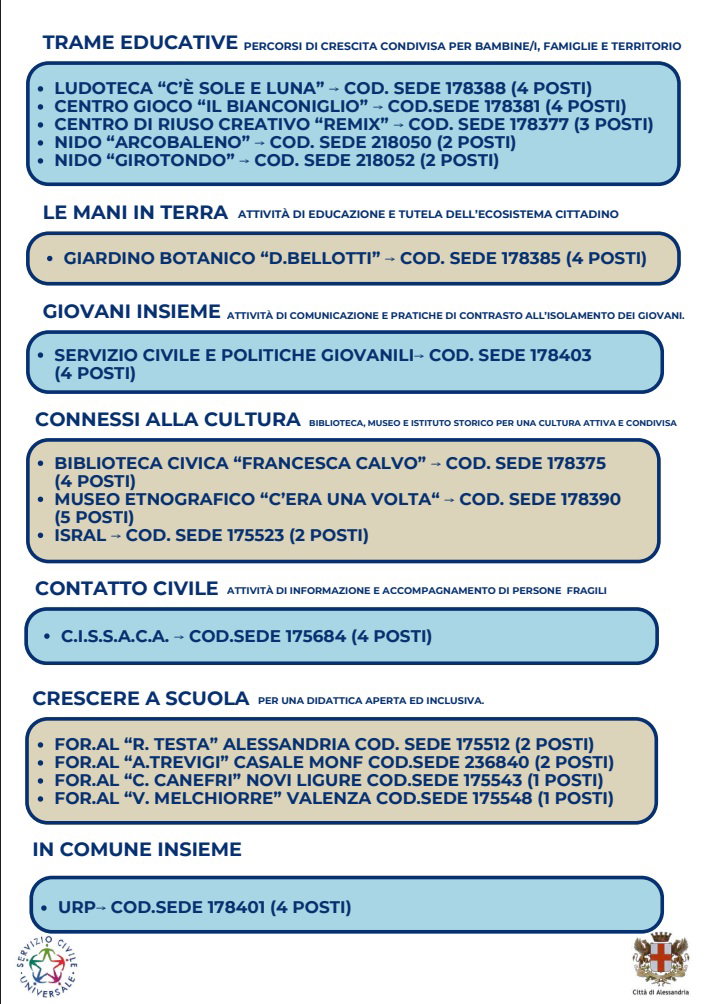 Per ulteriori informazioni è possibile consultare i link indicati o rivolgersi all’Ufficio Servizio Civile della Città di Alessandria per informazioni e supporto nella presentazione della domanda: Palazzo Cuttica – Via Gagliaudo 2 15121 Alessandria Tel. 0131 515784 Email: servizio.civile@comune.alessandria.it.