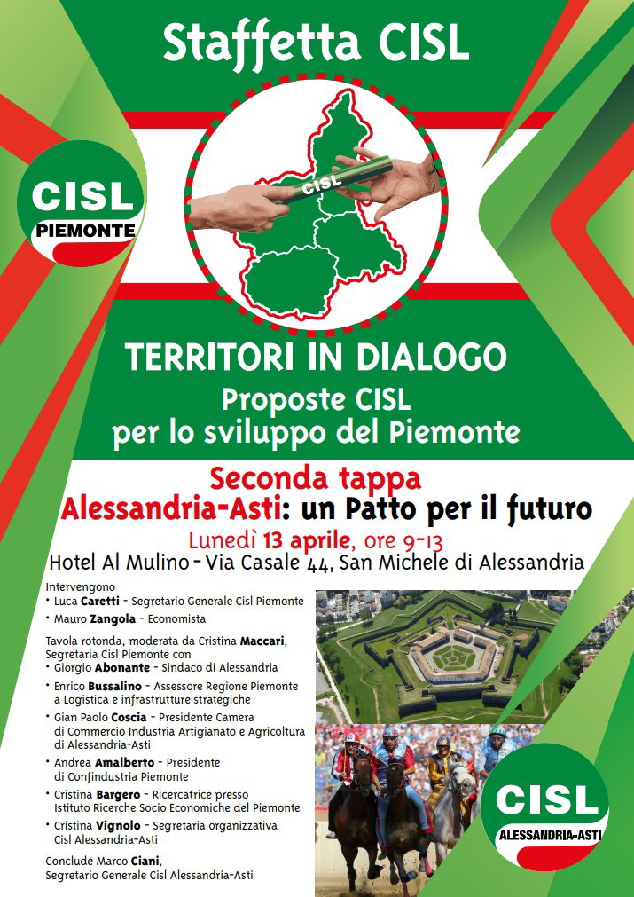 ALESSANDRIA – Lunedì 13 aprile, all’Hotel Al Mulino di San Michele di Alessandria (in via Casale 44), si terrà dalle 9 alle 13 la seconda tappa della “Staffetta Cisl – Territori in Dialogo“, il percorso itinerante con cui Cisl Piemonte sta costruendo, provincia per provincia, un’agenda di proposte per lo sviluppo del Piemonte. Al centro dell’appuntamento i territori di Alessandria e Asti, con le loro specificità produttive, infrastrutturali e sociali.