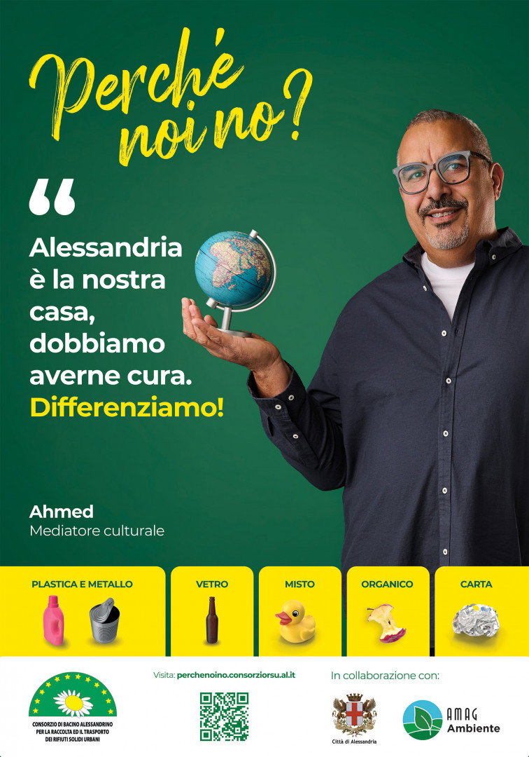 L’obiettivo è cambiare le abitudini quotidiane dei cittadini, prendendo esempio dai centri più piccoli della provincia: la domanda “Perché noi no?” è riferita proprio a questa disparità di risultati tra i centri zona e i paesi. Per questo la campagna abbandona i toni istituzionali e punta sulle persone comuni: volti familiari della città, protagonisti di un messaggio condiviso. Tra loro i baristi Angelo e Alessandro, che ricordano: “Per fare bene la differenziata non si mischia!”. Sonia, insegnante, invita a “resettare le cattive abitudini e installare la raccolta differenziata!”. Ahmed, mediatore culturale, sottolinea che Alessandria “è la nostra casa”, mentre lo studente Lorenzo definisce la differenziata “materia obbligatoria”. Presente anche Giuseppe di Amag Ambiente: “Se è nel bidone sbagliato, me ne accorgo!”.