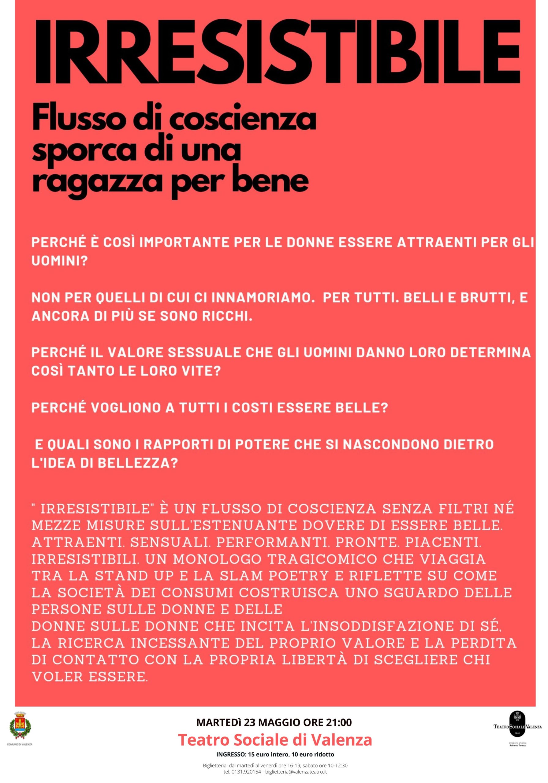 I dialoghi della Vagina è una stand-up commedia “dove l’interazione con il pubblico abbatte non solo la quarta parete, ma anche tabù e luoghi comuni legati all’universo femminile”. L’irresistibile capacità delle attrici di raccontare e raccontarsi, regala allo spettatore una performance esilarante e molti spunti di riflessione. A fare da sfondo, le opere della pittrice russa Elena Romanovskaya. La rassegna conosce poi due momenti con giovani attori della compagnia PEM. Martedì 9 maggio (ore 21) si esplorerà l’universo umoristico ed introspettivo di Pietro Maccabei, che con la collaborazione di Daniel Santantonio interpreta lo spettacolo dal titolo “Casa mia – Meglio nascere fortunati che ricchi”. Ed ancora successivamente martedì 23 maggio (ore 21) un’attrice della compagnia PEM, Lucia Raffaella Mariani, in “Irresistibile, ovvero la coscienza sporca di una ragazza per bene”, un monologo dal forte elemento autobiografico nel quale è possibile specchiarsi.