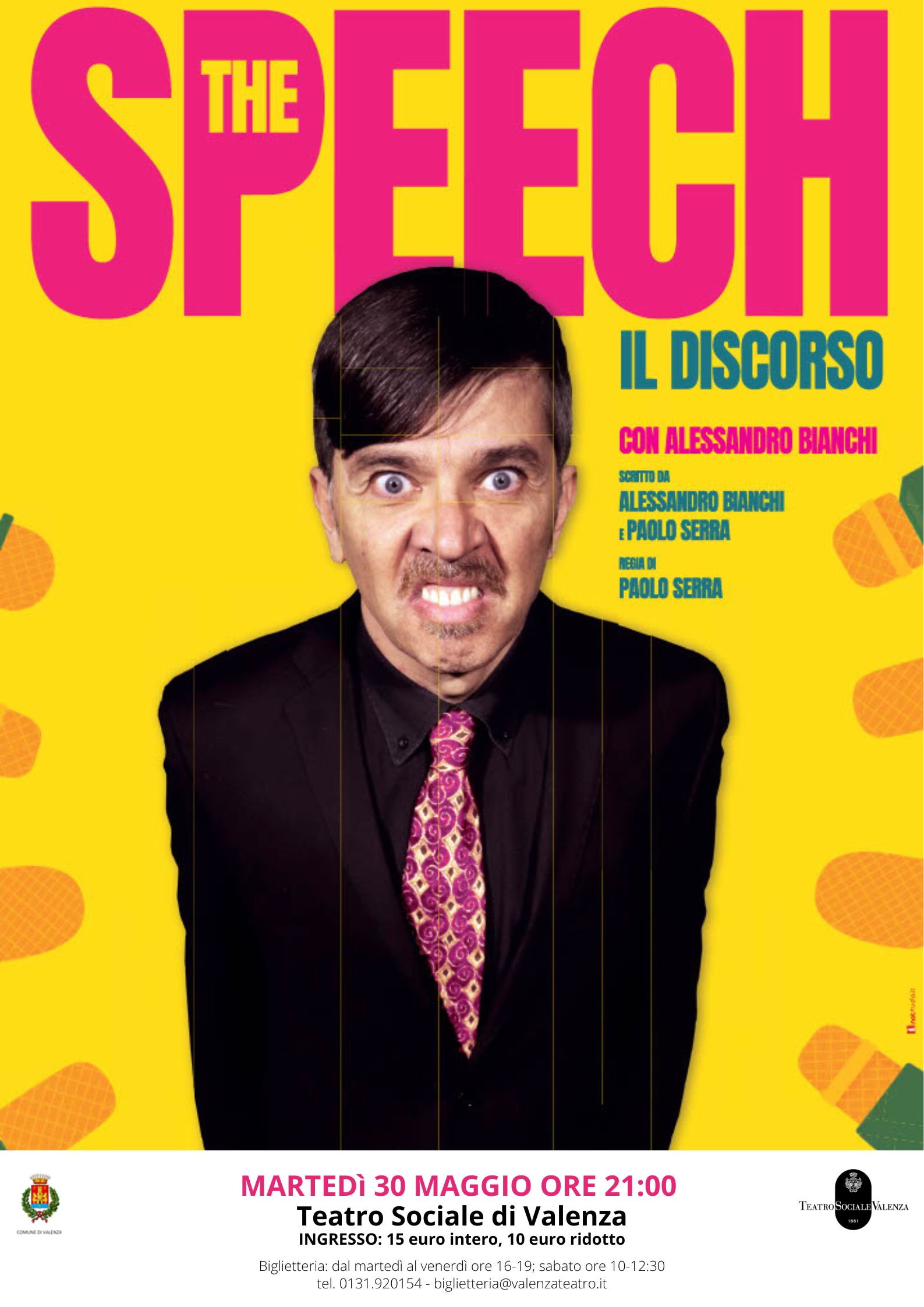 Il suo progetto si intitola “The Speech – Il Discorso” ed è “Un’apnea comica di sessanta minuti. Un’esperienza liberatoria, in cui il pubblico partecipa attivamente al disagio di un politico in balia del cinico umorismo del suo traduttore”. Scritto da Alessandro Bianchi e Paolo Serra che ne cura anche la regia, lo spettacolo, porta in scena tutto il ritmo e l’abilità di trasformismo dell’attore e comico Alessandro Bianchi. Biglietti: intero 15 euro, ridotto 10 euro (Soci Coop; abbonati stagione APRE), abbonamento a 4 spettacoli: 30 euro. Apertura botteghino: da martedì a venerdì dalle 16 alle 19,sabato ore 10-12.30 biglietteria@valenzateatro.it – telefono 0131.920154 e whatsapp 324.0838829