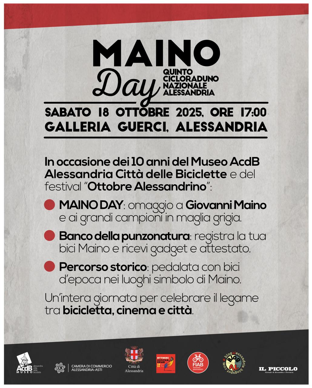 “È soprattutto una festa, un’occasione per stare insieme e costruire una rete” ha sottolineato il direttore Roberto Livraghi “Alessandria deve riscoprire il piacere di vivere la città, anche sorridendo e, perché no, pedalando su una Maino autentica”. Il programma dell’ACdB Fest si articola in tre momenti. Alle 17 parte il Maino Day, dedicato all’orgoglio alessandrino e a Giovanni Maino, pioniere della produzione ciclistica italiana. In Galleria Guerci sarà allestito il “banco della punzonatura”, dove registrare le biciclette Maino e ricevere un gadget. Seguirà una pedalata storica tra i luoghi della memoria Maino, animata dagli attori della compagnia Blogal, con arrivo in piazzetta della Lega.