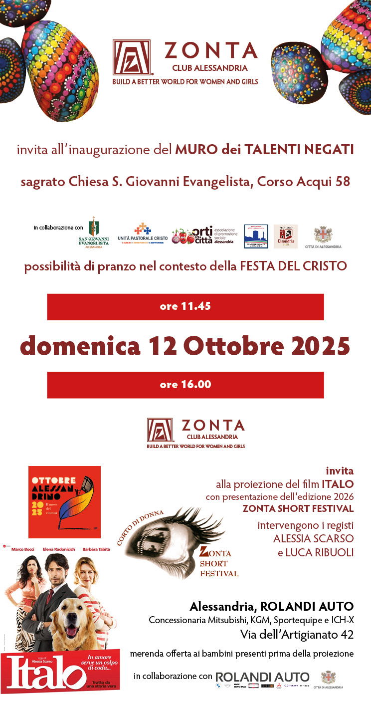 Dal 2012 Zonta International utilizza il cinema come strumento di sensibilizzazione. Il club alessandrino è l’unico al mondo a promuovere un festival dedicato alle donne registe e sceneggiatrici, aperto a tutti. L’ottava edizione, con Luca Ribuoli presidente di giuria, si concluderà il 27 maggio 2026 con la premiazione ufficiale.