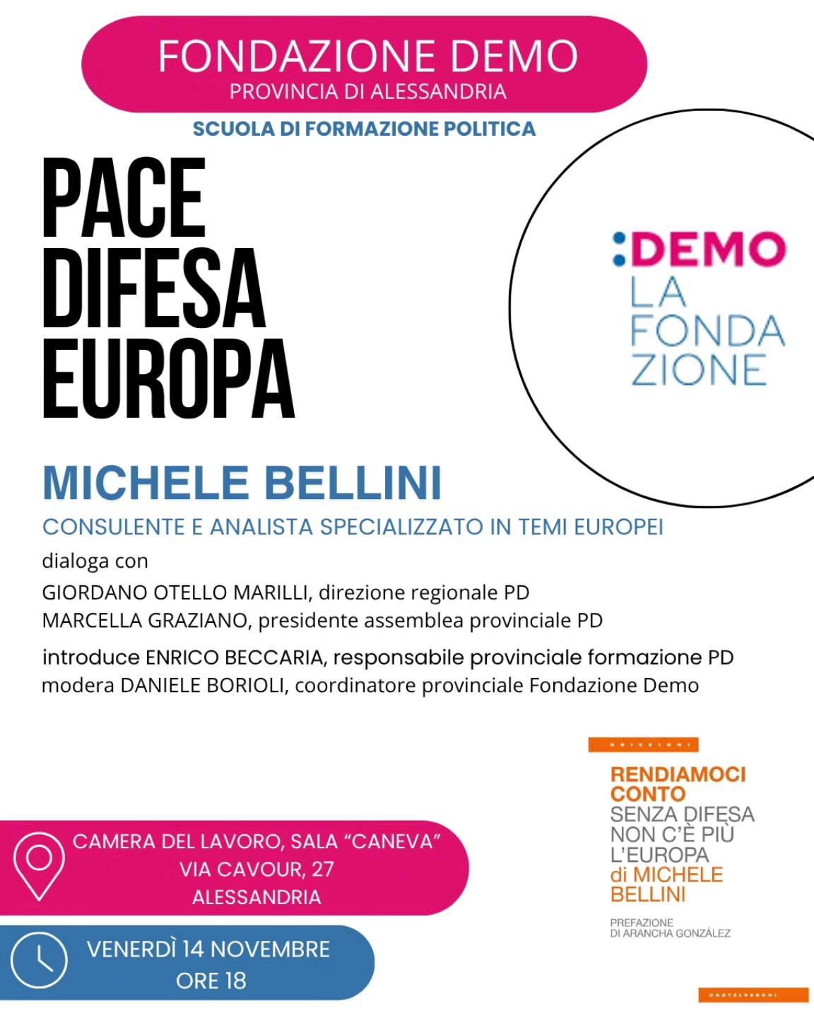 ALESSANDRIA – Questo venerdì 14 novembre alle 18 nella sala “Caneva” della Camera del Lavoro, in via Cavour 27, ad Alessandria, si terrà il primo incontro organizzato dalla Fondazione Demo e dalla Segreteria Provinciale del Partito Democratico di Alessandria, Scuola di Formazione Politica, su “Pace, difesa, Europa”, con la presentazione del libro di Michele Bellini, “Rendiamoci conto. Senza difesa non c’è più Europa”.