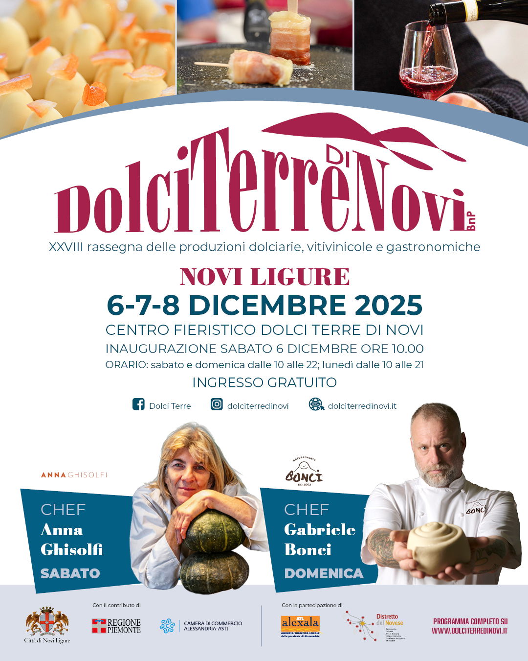NOVI LIGURE – Saranno oltre 80 gli espositori ospiti della 28esima edizione di Dolci Terre di Novi, la rassegna delle produzioni dolciarie, vitivinicole e gastronomiche prevista da sabato 6 a lunedì 8 dicembre 2025, al centro fieristico di viale Campionissimi, aperto il sabato e la domenica dalle 10 alle 22 e lunedì dalle 10 alle 21, con ingresso gratuito. Il taglio del nastro si terrà alle 10 di sabato 6 dicembre.