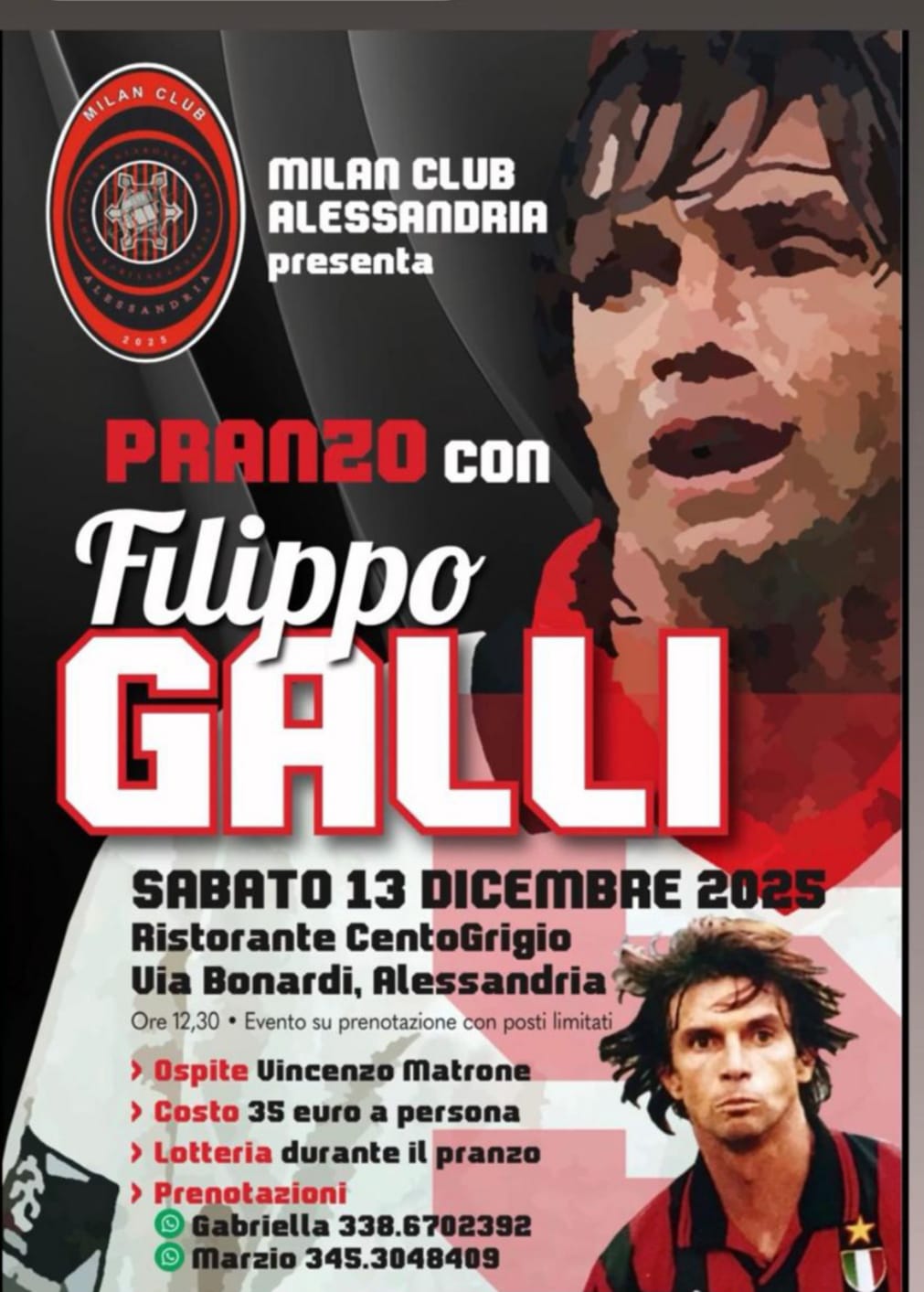 ALESSANDRIA – Il Milan Club di Alessandria ha organizzato per questo sabato 13 dicembre un pranzo con l’ex difensore rossonero Filippo Galli. Appuntamento al ristorante del Centogrigio, in via Bonardi 25. Inizio alle 12.30. Per partecipare all’evento, su prenotazione, è possibile chiamare i numeri 338/6702392 e 345/3048409.