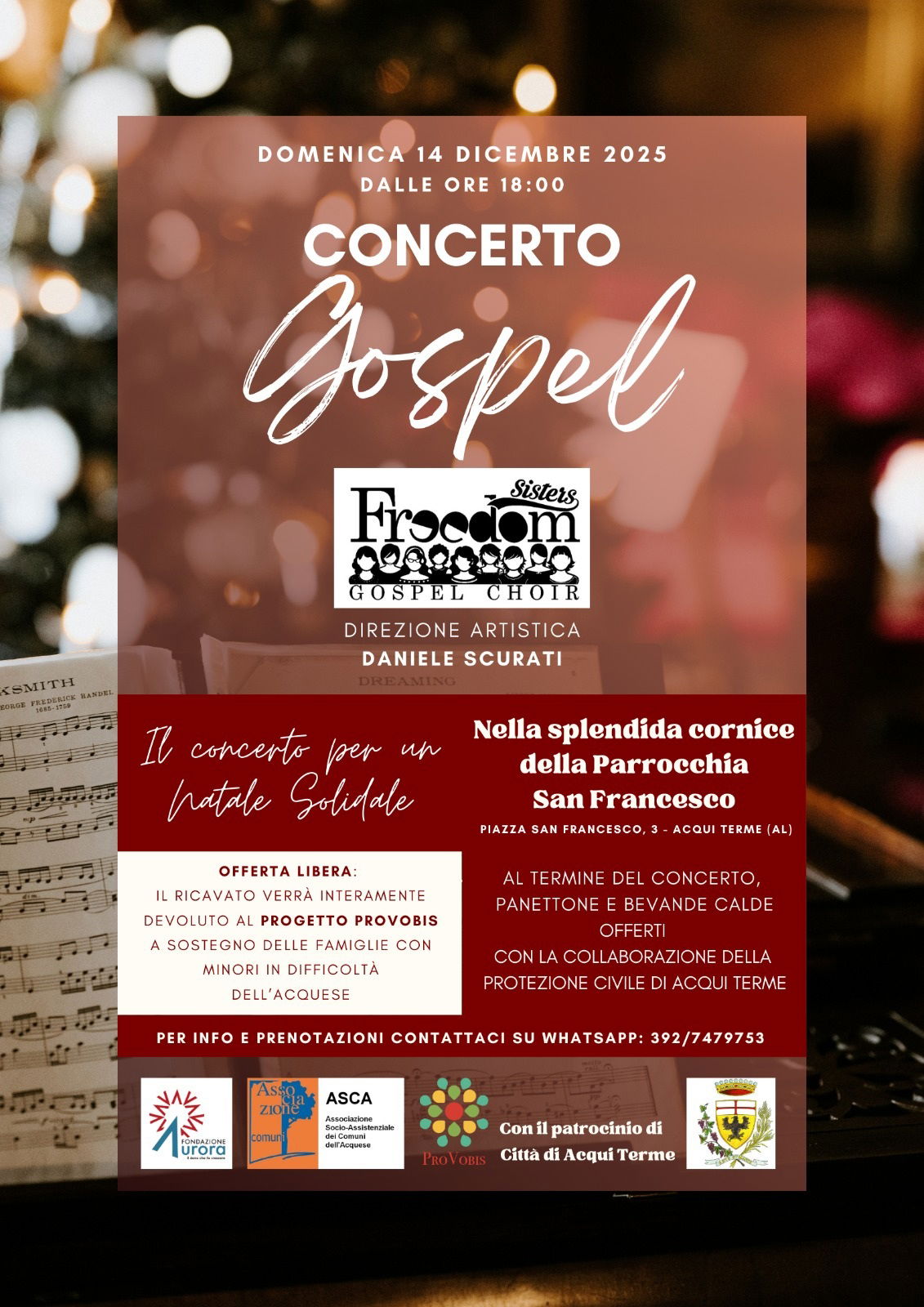 ACQUI TERME – Questa domenica 14 dicembre 2025 alle 18 la chiesa di San Francesco di Acqui Terme, in piazza San Francesco 3, ospiterà il concerto Gospel del coro “Freedom Sisters” diretto dal maestro Daniele Scurati. Le offerte raccolte durante il concerto saranno destinate al progetto Provobis a favore di famiglie con minori, uno dei progetti sostenuti da Fondazione Aurora per la Comunità Acquese. Dopo il concerto panettone, tè caldo e vin brulè per tutti, offerti dalla Protezione Civile davanti alla Chiesa e nella piazza del Comune.