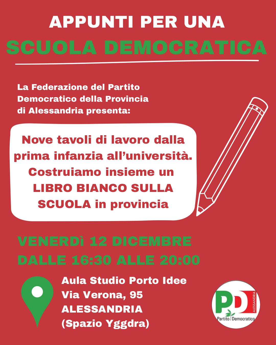 Per chi desiderasse partecipare ad uno dei tavoli potrà comunicarlo inviando una email a partitodemocratico.al@gmail.com. “Aspettiamo anche ed invitiamo alla partecipazione anche chi volesse essere presente solo come ascoltatore. Il futuro della scuola e dell’istruzione è importante per il presente delle nostre giovani generazioni e per lo sviluppo del nostro Paese”. L’evento si concluderà con un buffet augurale natalizio.