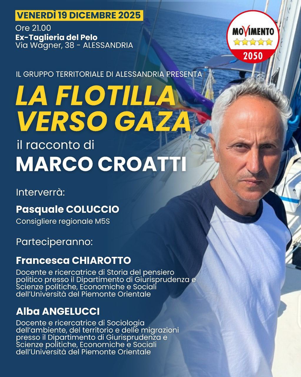 ALESSANDRIA – Il Gruppo Territoriale del MoVimento 5 Stelle di Alessandria ha organizzato per questo venerdì 19 dicembre alle 21 alla Ex Taglieria del Pelo, in via Wagner 38, un incontro pubblico di approfondimento dedicato alla situazione di Gaza e agli sviluppi in Medio Oriente. Ospite principale della serata sarà il senatore Marco Croatti, che porterà la propria testimonianza diretta maturata a bordo della Global Sumud Flotilla, missione internazionale che ha attirato l’attenzione dell’opinione pubblica mondiale sul conflitto e sulla crisi umanitaria in corso.