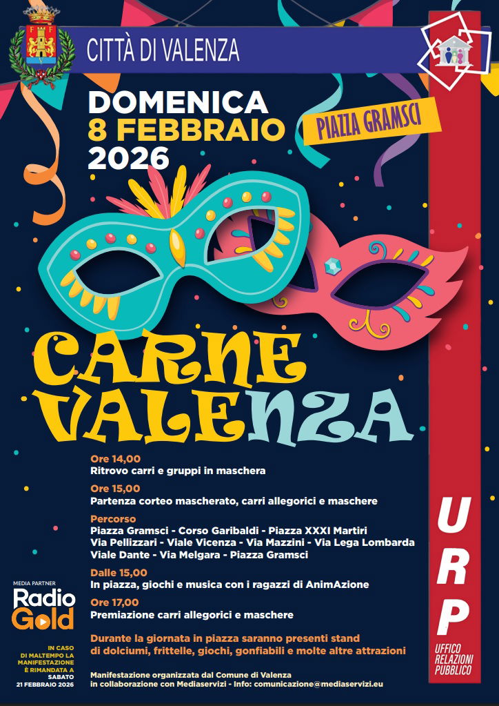 VALENZA – Domenica 8 febbraio 2026 torna l’appuntamento con il Carnevale di Valenza, una giornata di festa, colori e musica nel cuore della città, con partenza e arrivo in piazza Gramsci. Il programma si apre alle 14 con il ritrovo di carri e gruppi in maschera, mentre alle 15 prenderà il via il corteo mascherato con carri allegorici e maschere. Il percorso toccherà piazza Gramsci, corso Garibaldi, piazza XXXI Martiri, via Pellizzari, viale Vicenza, via Mazzini, via Lega Lombarda, viale Dante e via Melgara, per poi tornare in piazza Gramsci.