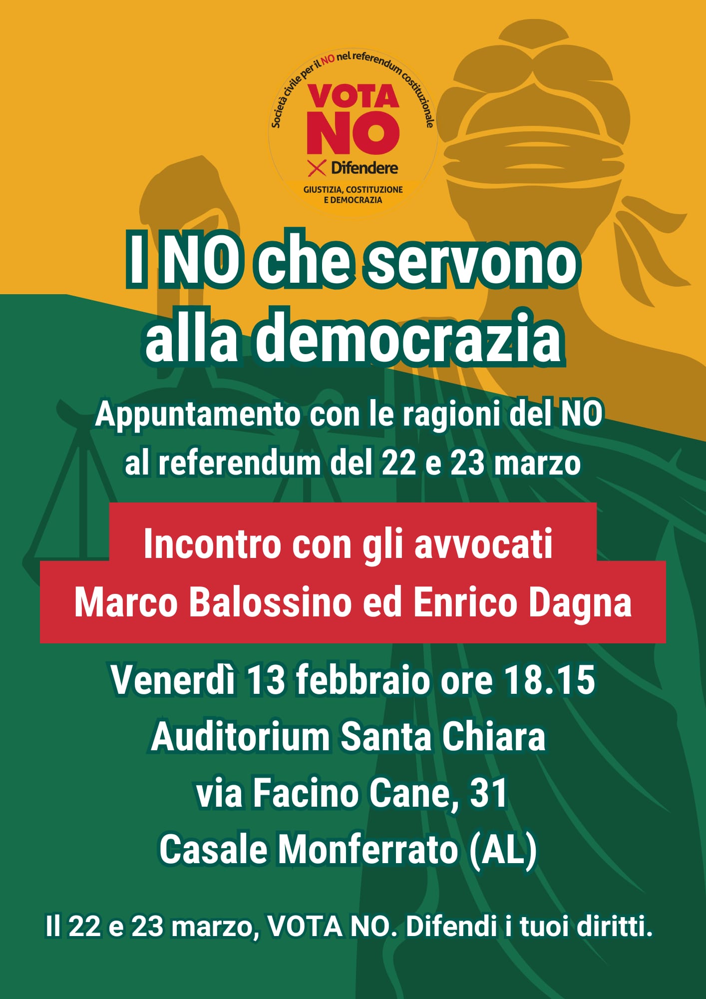 CASALE MONFERRATO – Un incontro pubblico a Casale Monferrato per approfondire le ragioni del no al referendum sulla Giustizia in programma il 22 e 23 marzo. L’appuntamento è fissato per venerdì 13 febbraio alle 18.15 all’Auditorium Santa Chiara, in via Facino Cane 31. Al centro della serata, dal titolo “I no che servono alla democrazia”, un confronto sui temi di giustizia, Costituzione e democrazia, con l’intervento degli avvocati Marco Balossino ed Enrico Dagna. L’iniziativa rientra nel percorso di informazione e dibattito in vista del voto referendario ed è aperta alla cittadinanza.