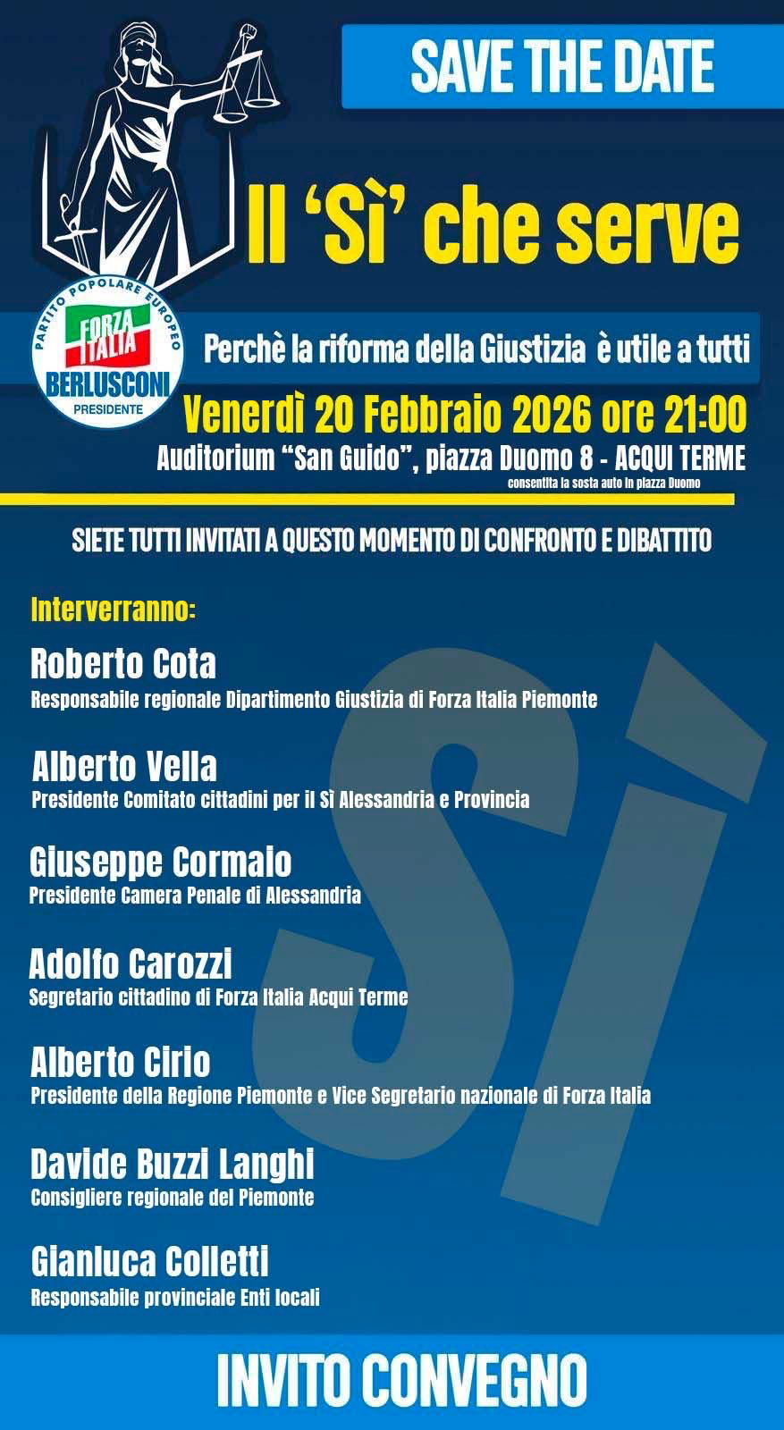 ACQUI TERME – Venerdì 20 febbraio alle 21 all’Auditorium “San Guido” di piazza Duomo 8 ad Acqui Terme si terrà l’incontro pubblico “Il Sì che serve–Perché la riforma della Giustizia è utile a tutti”, promosso dal Comitato Cittadini per il Sì di Alessandria e Provincia e dalla segreteria cittadina di Forza Italia Acqui Terme. Ingresso libero. L’iniziativa vuole essere un momento di confronto e approfondimento sul tema della riforma della Giustizia, con l’obiettivo di illustrarne contenuti e possibili ricadute su cittadini, imprese e istituzioni in vista del referendum.