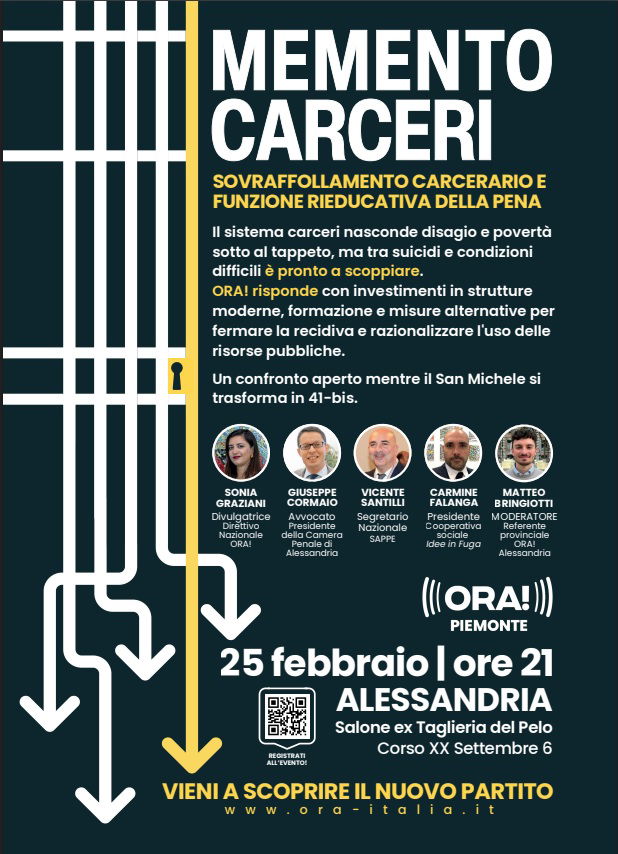 ALESSANDRIA – Si intitola “Memento Carceri – Sovraffollamento carcerario e funzione rieducativa della pena” l’incontro pubblico in programma il 25 febbraio alle 21 al Salone ex Taglieria del Pelo in corso XX Settembre 6. L’iniziativa, promosso dal partito Ora!, propone un confronto aperto sul sistema penitenziario tra sovraffollamento, suicidi e condizioni difficili negli istituti. Al centro del dibattito anche la trasformazione del carcere San Michele in 41-bis. “Il sistema carceri nasconde disagio e povertà sotto al tappeto, ma tra suicidi e condizioni difficili è pronto a scoppiare. Ora risponde con investimenti in strutture moderne, formazione e misure alternative per fermare la recidiva e razionalizzare l’uso delle risorse pubbliche” si legge nella presentazione dell’evento. Interverranno la divulgatrice e componente del direttivo nazionale del partito Ora! Sonia Graziani, il presidente della Camera Penale di Alessandria Giuseppe Cormaio, il segretario nazionale del sindacato Sappe Vicente Santilli, il presidente della cooperativa Idee in Fuga Carmine Falanga e il referente provinciale di Ora! Alessandria Matteo Bringiotti. L’appuntamento è a ingresso libero.