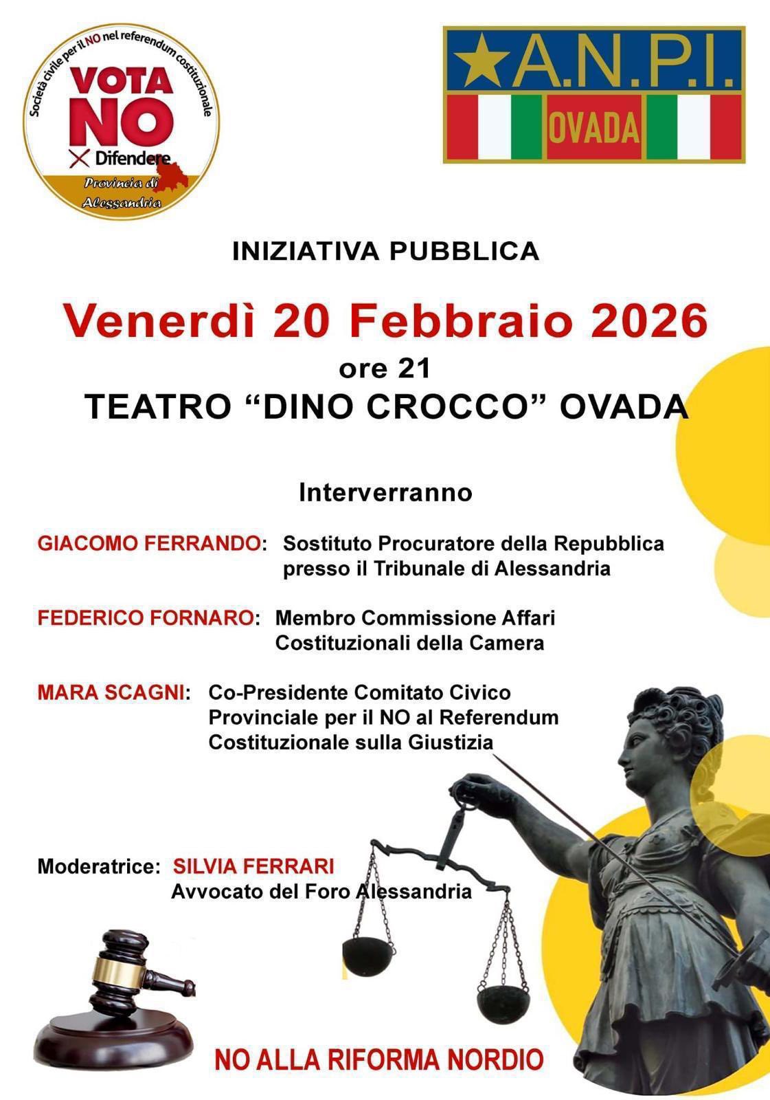 OVADA – Un’iniziativa pubblica per dire no al referendum sulla Giustizia dei prossimi 22 e 23 marzo. L’appuntamento, promosso dal Comitato per il No e dall’Anpi di Ovada, è fissato per venerdì 20 febbraio alle 21 al Teatro “Dino Crocco” di Ovada. Durante la serata interverranno Giacomo Ferrando, sostituto procuratore della Repubblica al Tribunale di Alessandria, Federico Fornaro, membro della Commissione Affari Costituzionali della Camera, e Mara Scagni, co-presidente del Comitato Civico Provinciale per il No al Referendum Costituzionale sulla Giustizia. A moderare l’incontro sarà Silvia Ferrari, avvocato del Foro di Alessandria.
