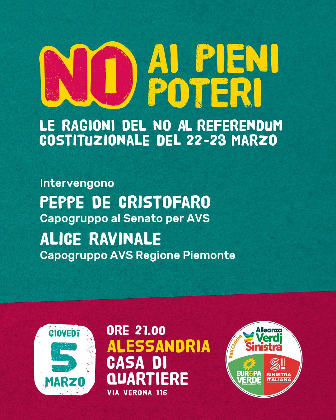ALESSANDRIA – Mercoledì 5 marzo alle 21 alla Casa di Quartiere di via Verona 116, ad Alessandria, si terrà un incontro pubblico sulle ragioni del No al referendum costituzionale del 22 e 23 marzo. L’iniziativa, promossa da Alleanza Verdi Sinistra dal titolo “No ai pieni poteri”, vedrà gli interventi del senatore Peppe De Cristofaro, capogruppo in Senato per AVS, e di Alice Ravinale, capogruppo AVS in Consiglio regionale del Piemonte. L’appuntamento è aperto alla cittadinanza e punta a promuovere partecipazione e informazione in vista del voto.