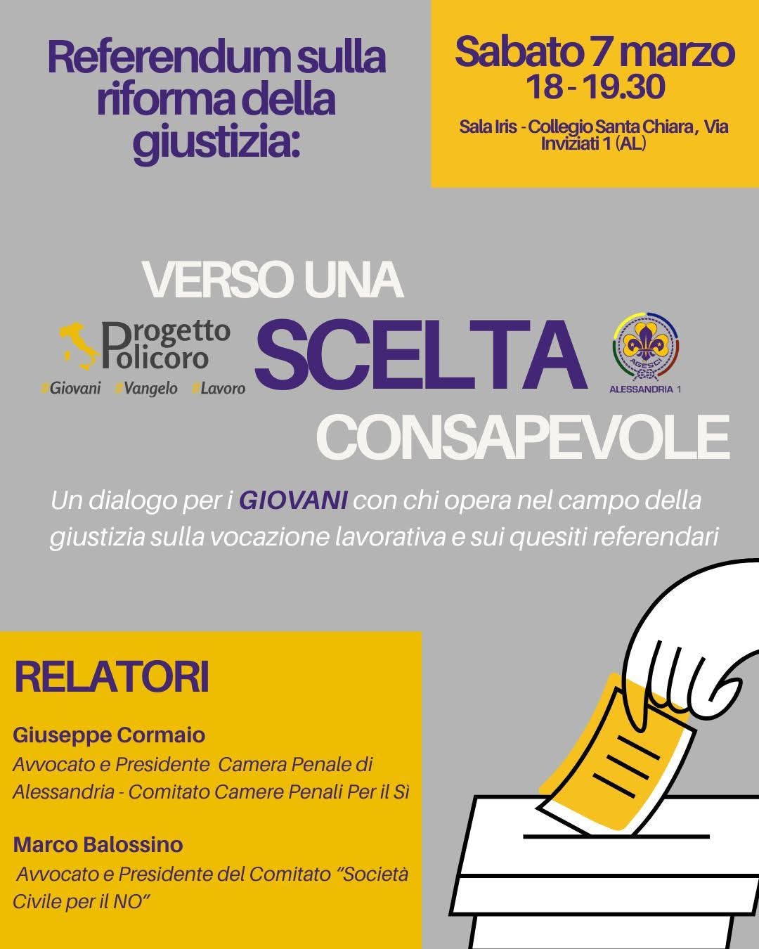 ALESSANDRIA – Un momento di confronto dedicato ai giovani e al tema del referendum sulla riforma della giustizia. L’appuntamento è per sabato 7 marzo dalle 18 alle 19.30 alla Sala Iris del Collegio Santa Chiara, in via Inviziati 1, ad Alessandria. L’iniziativa, dal titolo “Verso una scelta consapevole”, è promossa nell’ambito del Progetto Policoro e dell’Agesci e propone un dialogo con chi opera nel campo della giustizia sui quesiti referendari e sulla vocazione lavorativa. Interverranno Giuseppe Cormaio, avvocato e presidente della Camera Penale di Alessandria-Comitato Camere Penali per il Sì, e Marco Balossino, avvocato e presidente del Comitato “Società Civile per il No”.