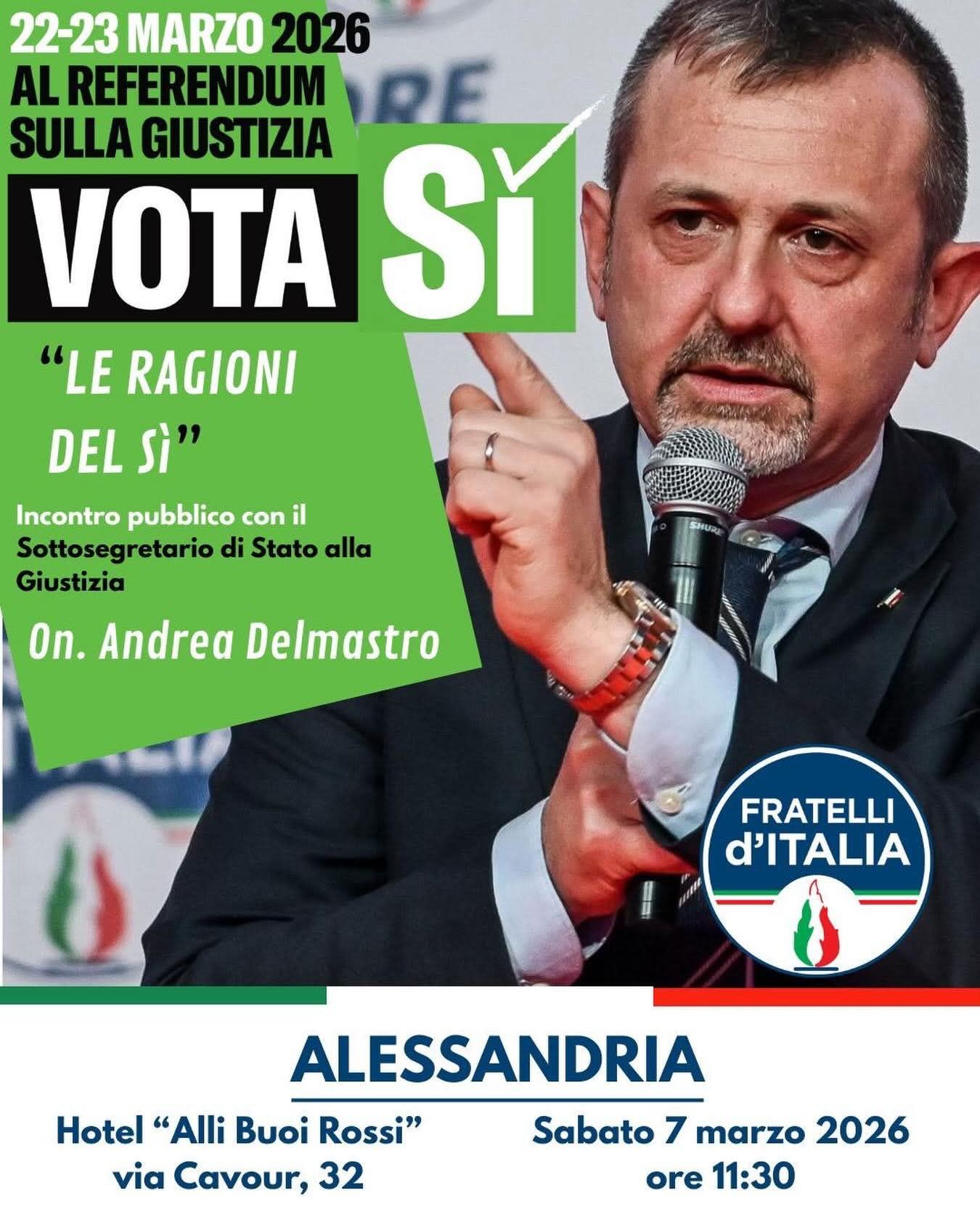 ALESSANDRIA – Sabato 7 marzo alle 11.30 all’Hotel “Alli Buoi Rossi” di via Cavour 32 ad Alessandria è in programma un incontro pubblico dal titolo “Le ragioni del Sì” in vista del referendum sulla giustizia del 22 e 23 marzo 2026. All’appuntamento interverrà il sottosegretario di Stato alla Giustizia Andrea Delmastro, esponente di Fratelli d’Italia, per illustrare le motivazioni a sostegno del “Sì” al voto referendario. L’iniziativa rientra nella campagna informativa legata al referendum e sarà aperta al pubblico.