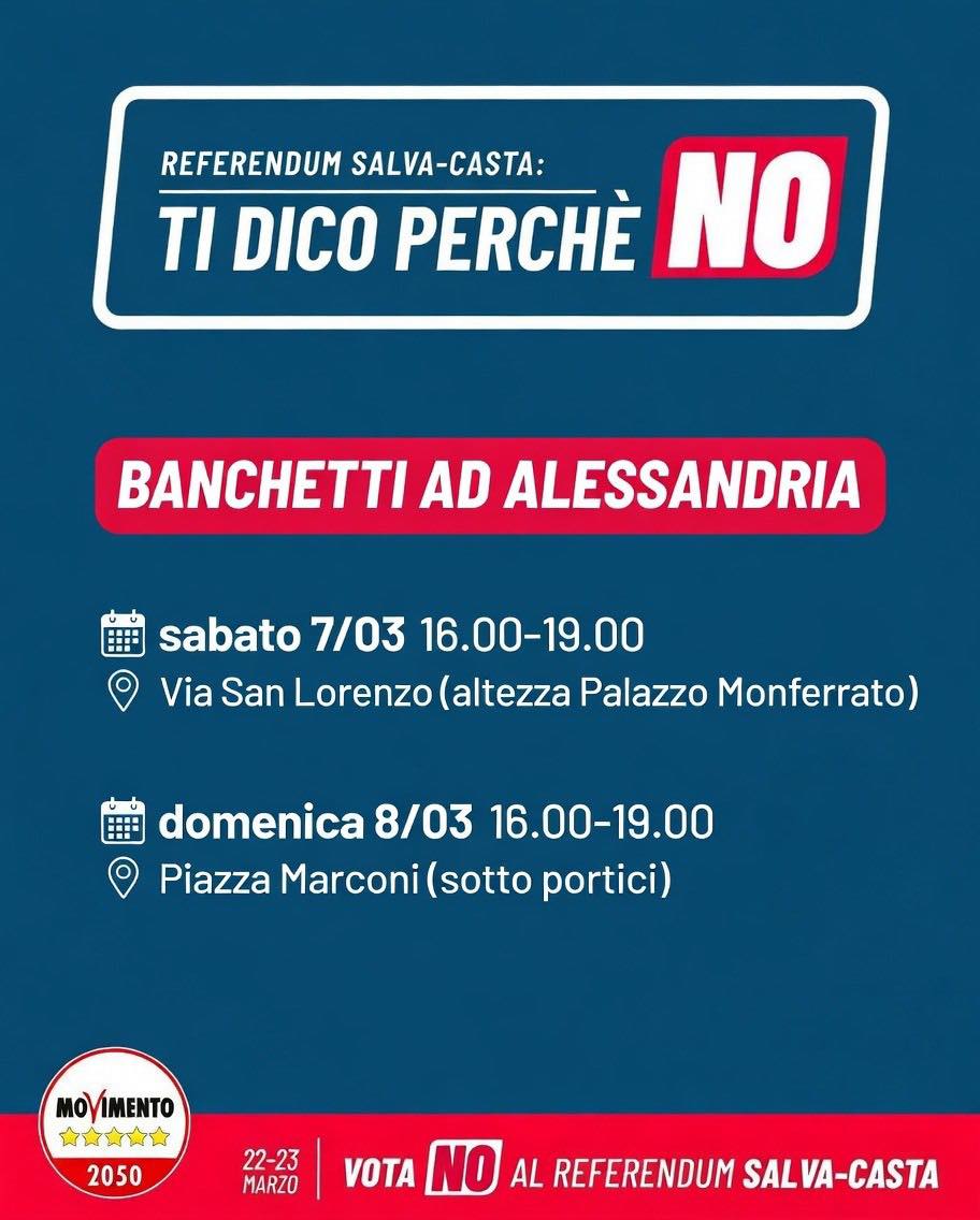 ALESSANDRIA – In vista del referendum sulla Giustizia del 22 e 23 aprile, il Movimento 5 Stelle di Alessandria ha promosso questo fine settimana dei banchetti informativi in centro per raccontare ai cittadini le ragioni del No. Appuntamento con gli attivisti ed esponenti pentastellati sabato 7 marzo dalle 16 alle 19 in via San Lorenzo 21 e domenica 8 marzo dalle 16 alle 19 sotto i portici di piazza Marconi.