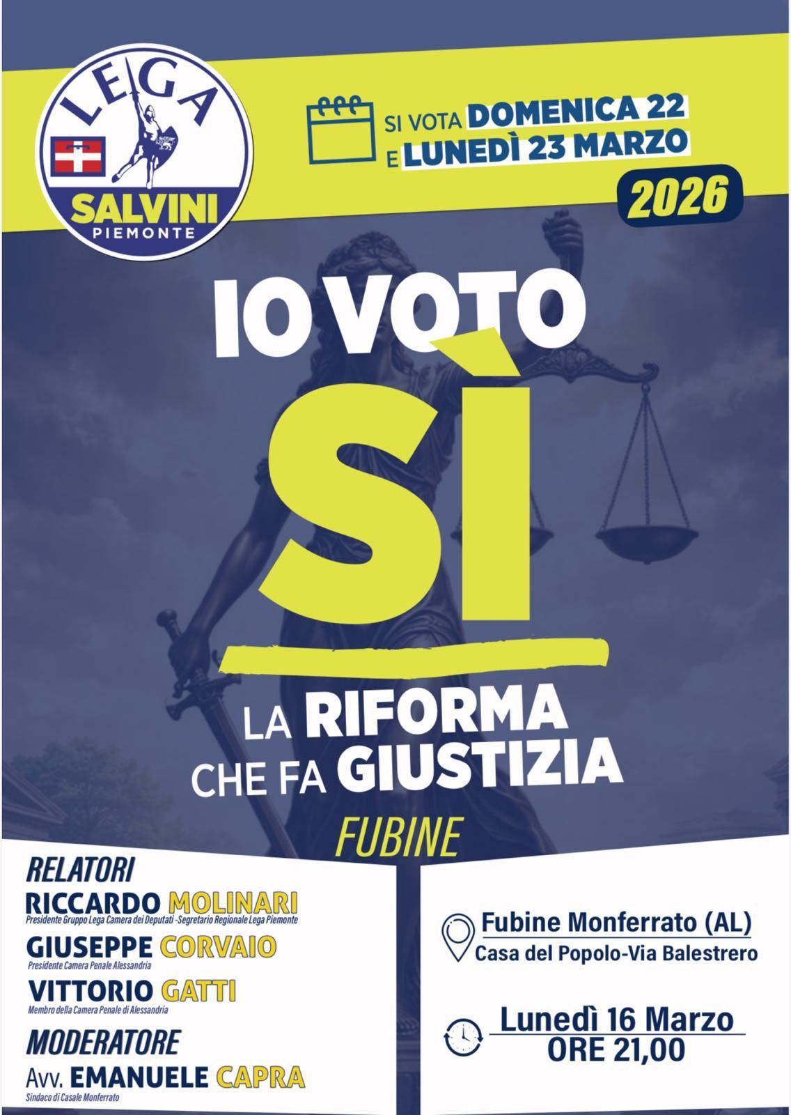 FUBINE – In vista del Referendum sulla Giustizia del 22 e del 23 marzo, questo lunedì 16 marzo la Lega ha promosso un incontro pubblico per il Sì a Fubine. Appuntamento alla Casa del Popolo, in via Balestrero 14. Inizio alle 21. Interverranno l’Onorevole Riccardo Molinari, capogruppo alla Camera e segretario regionale del Carroccio, il presidente della Camera Penale di Alessandria Giuseppe Corvaio, e Vittorio Gatti, membro della Camera Penale. Modererà il dibattito l’avvocato Emanuele Capra, sindaco di Casale.